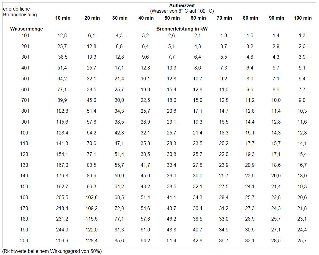 Ich hab eine Tabelle angefügt wo man die notwendige Brennerleistung gut bei den unterschiedlichen Wassermengen ablesen kann.