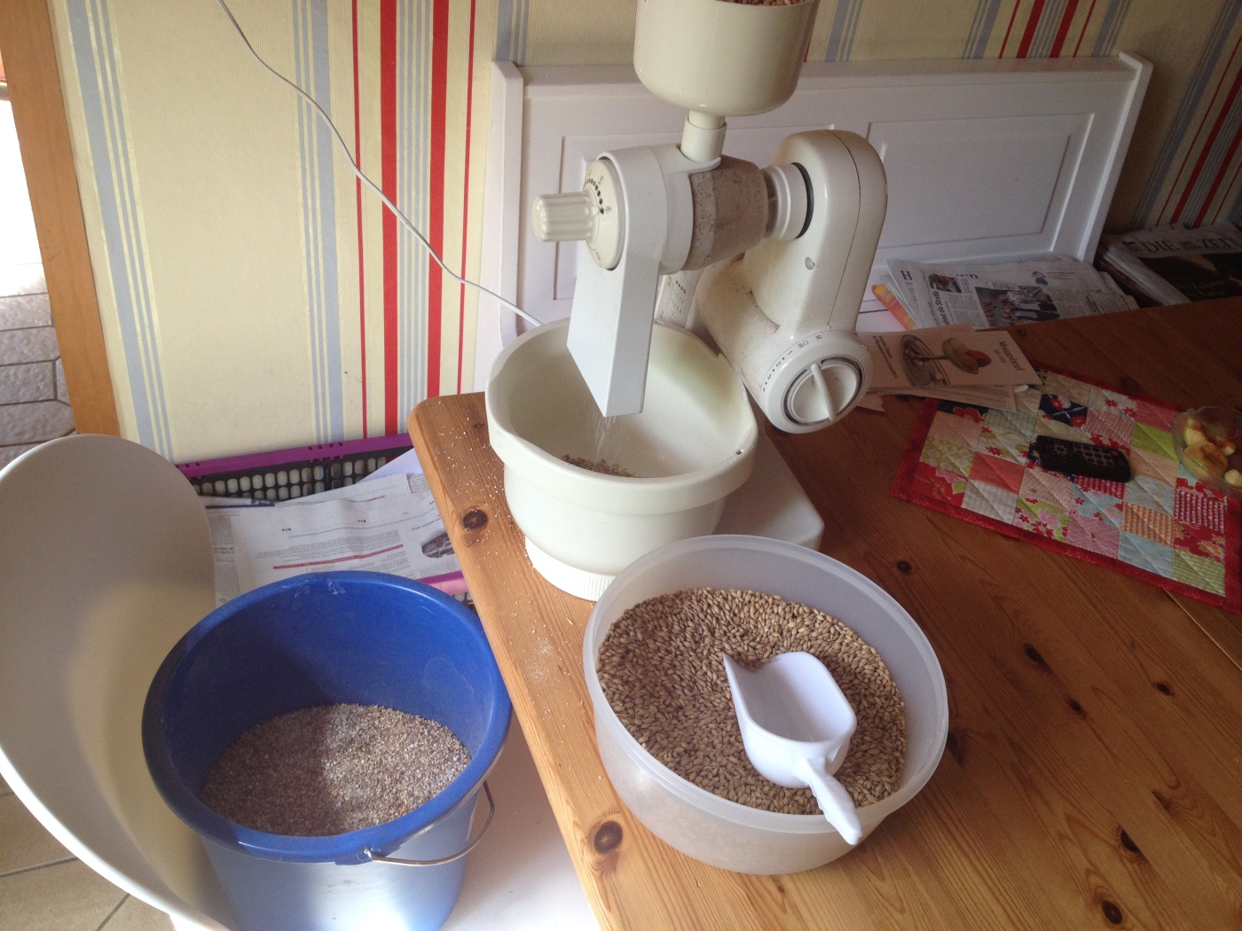 Schrotbild: finde ich klasse! Ist das ne Bosch MUM mit der "Getreidemühle" dran? Das Ding dürfte dafür ganz gut funktionieren, da es ja zerkleinert und nicht mahlt.