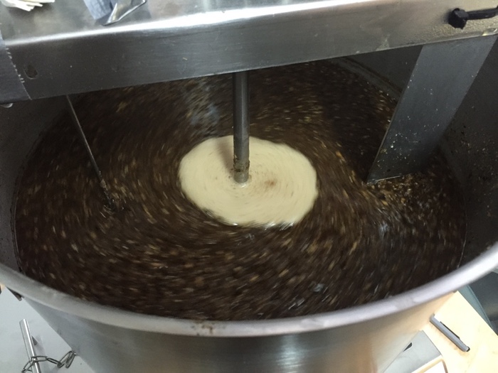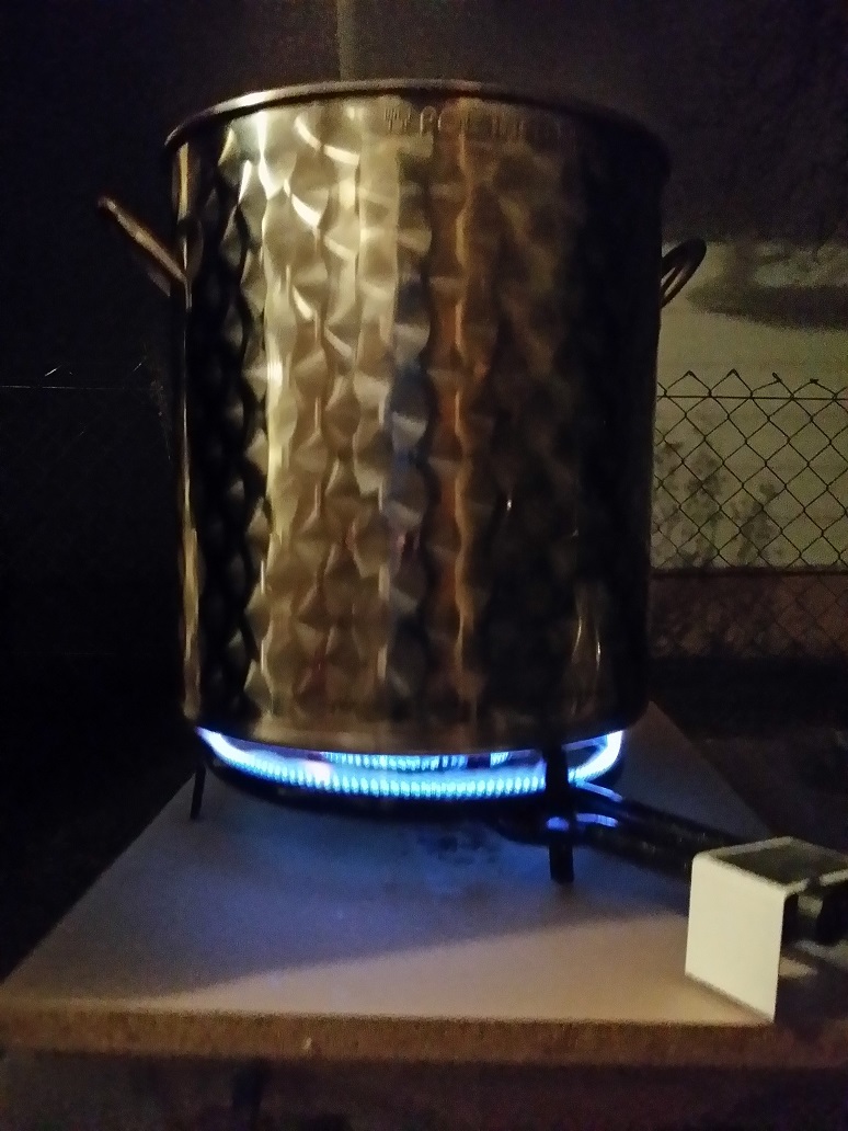 Hier wird der Hauptguss im 70L Polsinelli Edelstahltopf auf 12 kW Gasbrenner erhitzt.