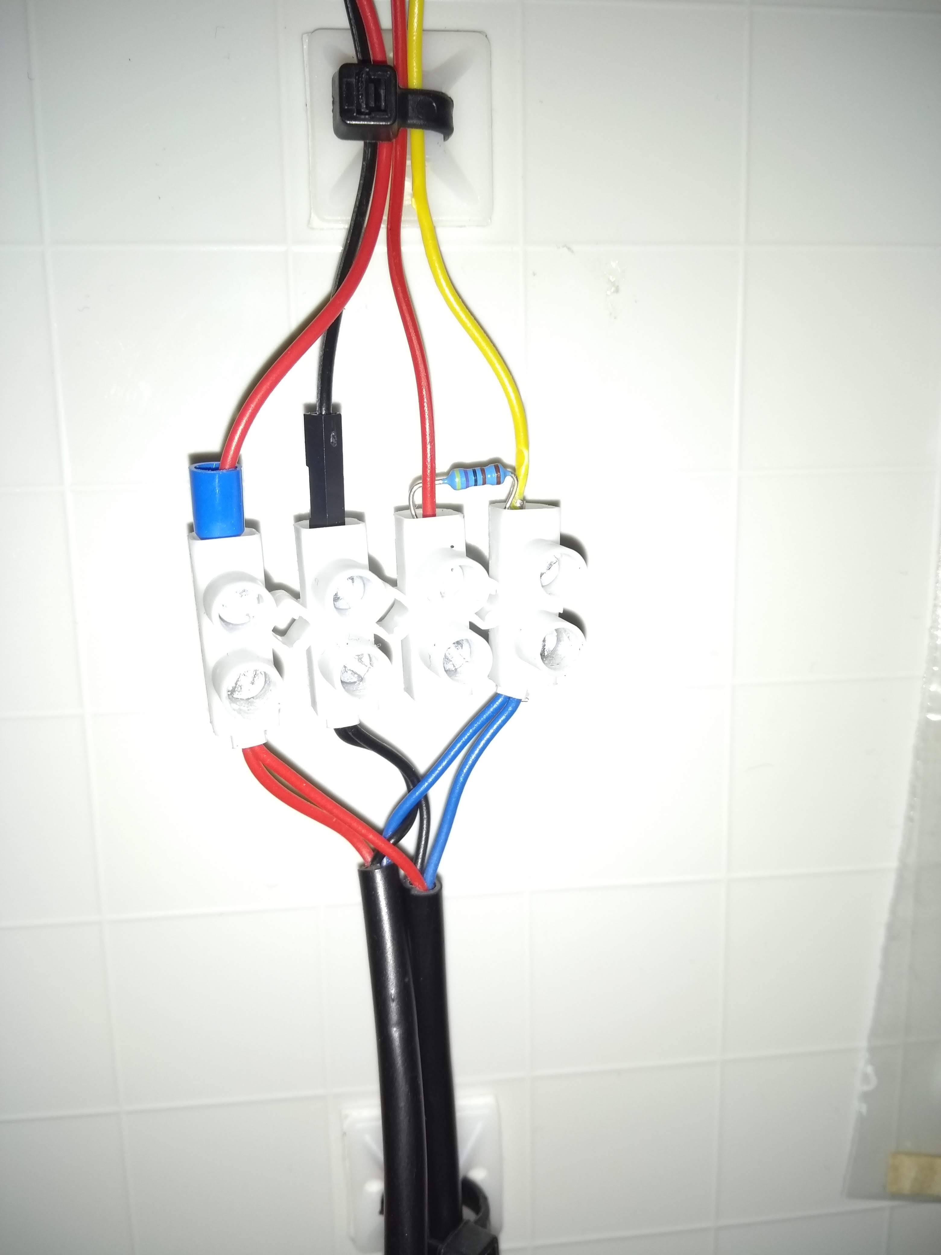 - Wichtig ist nun noch ein Widerstand von 4,7 kOhm zwischen den physikalischen Pin 1 des Raspberry Pi GPIO und der gelben/weißen Leitung anzuschließen. Wo Ihr diesen anschließt (also direkt am Pi, oder z.B. an einer Buchse am Gehäuse) ist egal.