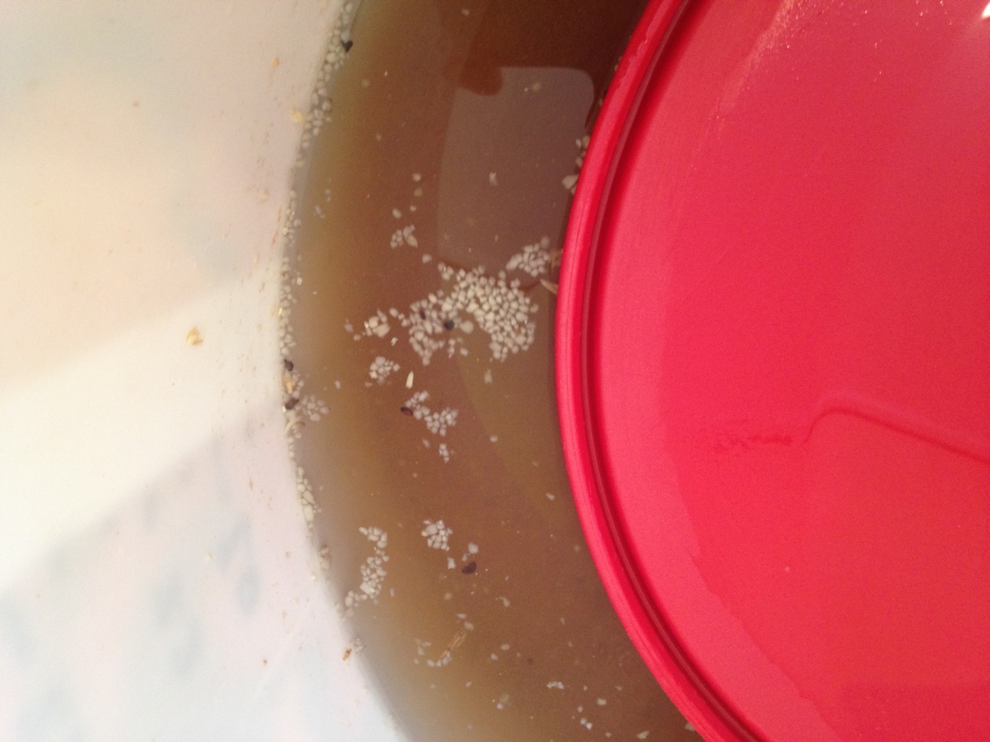 Jetzt kam etwas, was ich noch nicht kannte. Auf der Maische schwammen kleine Pflanzenteile, die wie Keimlinge aussahen (nicht im Bild). Außerdem waren kleine weiße bis leicht grünliche Bröckchen zu sehen.