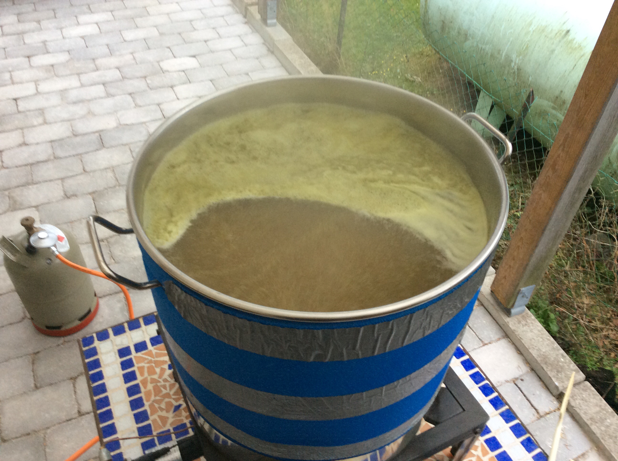 Nach dem Whirlpool ging alles durch einen Flitersack und dann durch den Plattenkühler. Am Ende landeten 40l Würze bei 16C im Gärfaß.