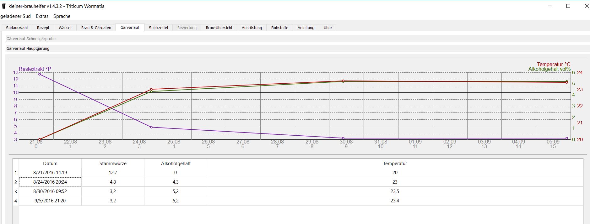 Ich habe vorletzten Sonntag (21.08.) ein Triticum Wormatia gebraut. Hefe war die Wyeast 3068 Smack Pack, Ausschlagwürze 30l, Anstelltemperatur 22 Grad, Karbonathärte des Brauwassers ca. auf 11. Leider war eine Essigmücke beim anstellen drin.