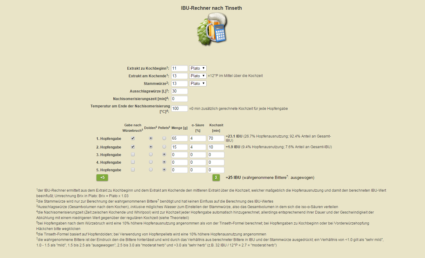 Ach ja - und nicht vergessen die Nachisomerisierungszeit mit einzubeziehen. Gerade wenn Du späte Hopfengaben machst kann das die Bittere noch beeinflussen je nach dem wie lange du vom Ende des Kochens bis zum Hopfenseihen brauchst. Bei mir ist es immer 30min und die Temperatur ist da meist noch bei etwa 90°C.