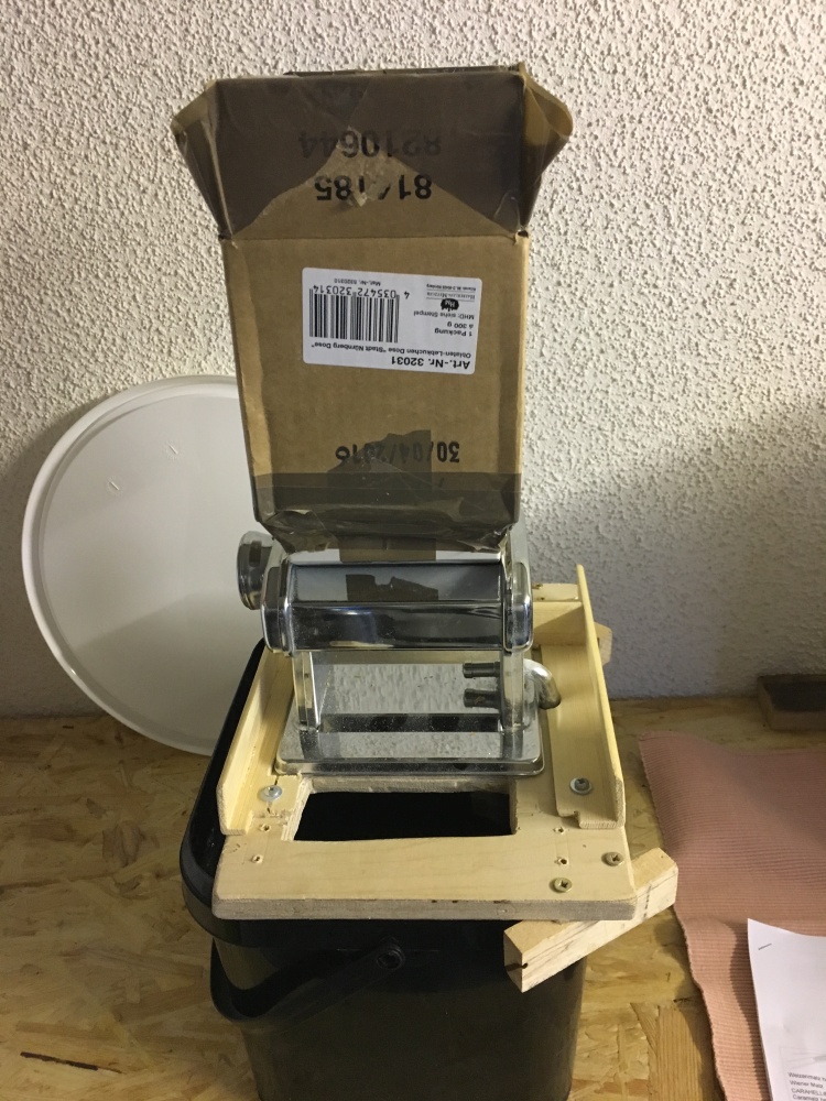 Die Wahl fiel auf einen Klarstein Biggi digital mit Rührwerk von Sascha. Malzmühle, Hobbock mit Läuterhexe und ein billiger Einkocher für den Nachguss mit 1.800 Watt waren schon da, ebenso zufällig ein 1.500 Watt Tauchsieder, der woanders gerade übrig war.