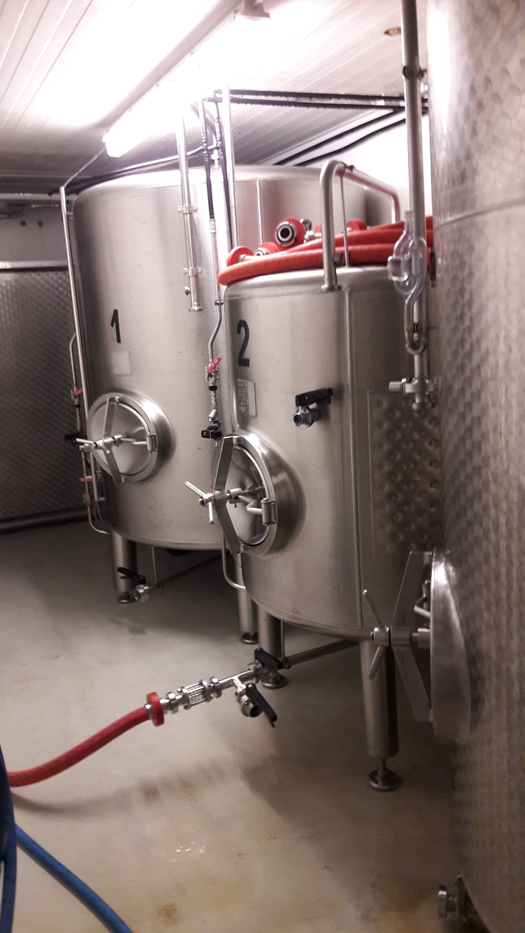 - Das Sudhaus. Rechts steht der Maischbottich, was auch für's Hopfenkochen benutzt wird. Nach dem Maischen wird's bis in den linken Bottich gepumpt, wo es abgeläuteret wird (Läuterblech). Von da wird's zurück nach rechts gepumpt für's Hopfenkochen, und dann wieder nach links für's Whirlpool.
