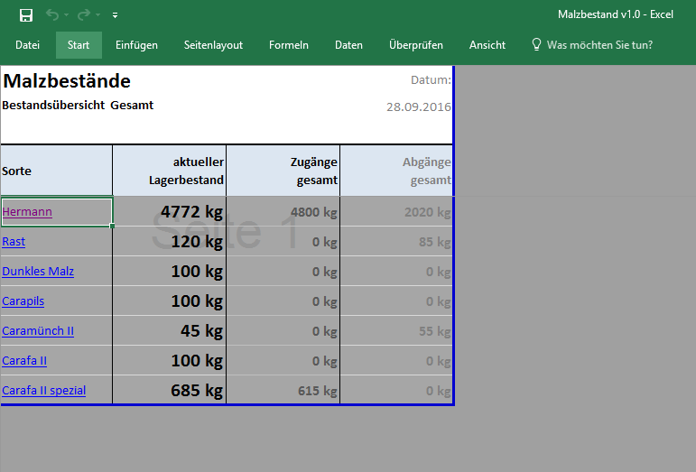 Für jede Sorte gibt es ein extra Arbeitsblatt, in dem die Zu- und Abgänge verzeichnet werden. Diese werden dann automatisch mit in der Gesamtübersicht verrechnet.