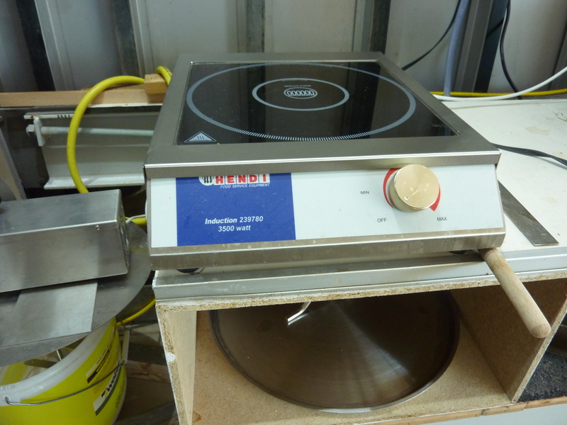 Ich habe von Anfang an hinten an der Platte die kleine Edelstahlleiste abgeschraubt (ist plan mit der Oberfläche) und habe ein Alu-U-Profil von 6 cm breite aus dem Baumarkt passend gesägt, also die Aussparungen für die Lüfter hinten in das Alu-U Profil übertragen. Anschließend habe ich die Alu-Vorrichtung plan hinten anstelle der Leiste angeschraubt. Das Alu-Profil habe ich noch mit zwei kleinen, durch schrauben verstellbaren Alu-Möbelfüssen aus dem Baumarkt versehen. Wenn ich braue , schraube ich die Füße soweit heraus, das sie die Last mit aufnehmen, oben aber das Alu-Profil plan bleibt. Den Topf stelle ich dann vor dem Einmaischen auf die Platte und soweit nach hinten mit auf das Aluprofil, das hier ein Teil der ganzen Last getragen wird. Funktioniert prima auch bei 12 Kg Malz und ca. 50l Wasser. Die Wärmeverteilung ist durch mein Rührwerk gegeben, bei Bedarf kann die Hendi-Platte auch durch Austauschen der Originalleiste gegen das Alu-Profil wieder zurück gebaut werden, sind lediglich 3 Schrauben zu lösen.