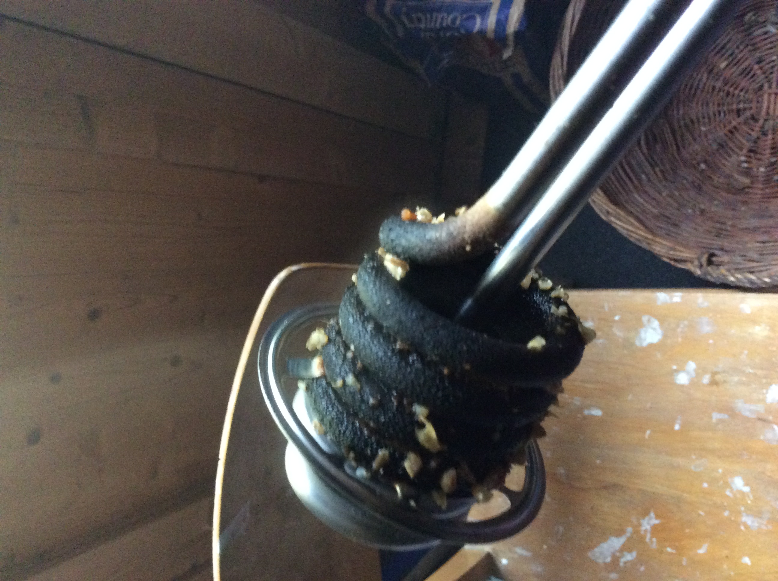 Der Grund siehe Foto. kann ja kaum mehr funktionieren! ich arbeite mit Maischesack und Abstandshalter vom Boden und habe schon fleißig umgerührt, kam aber eben nicht an den Boden. der Belag wirkt wie eine Isolierung. um 3:30 konnte ich nun doch wieder in der Küche den Kochvorgang doch noch vollenden. Das Ergebnis ist gottseidank ohne Brandgeschmack und 13%