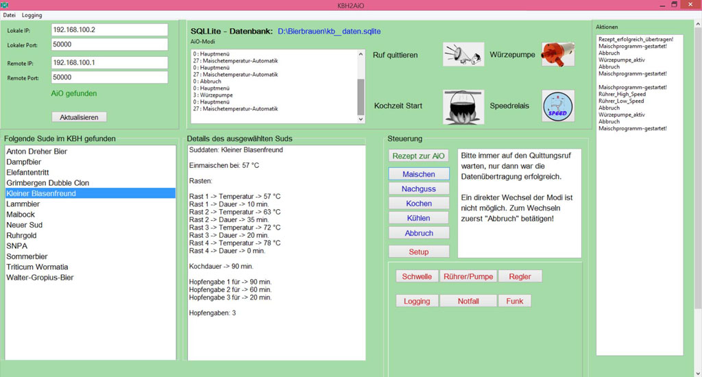 Gesteuert wird das ganze über eine Windows-Software KBH2AiO. Wie der Name schon sagt, wurden ursprünglich nur die Rezepte aus dem "Kleinen Brauhelfer" übertragen, nun kann man hierüber auch die komplette AiO-MEGA steuern.