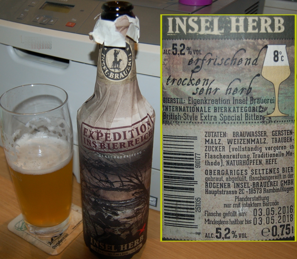 Dann habe ich noch eine Expedition ins Bierreich gemacht, das Insel Herb von der Inselbrauerei, siehe auch das Bild. Das Etikett verspricht: trocken, sehr herb. Ich möchte meinen, trocken ist es, aber nicht unangenhem. Herb ist es hingegen nicht allzusehr, jedenfalls ist die Bittere angenehm eingebunden und nicht kratzig oder nachhängend und schon gar nicht "sehr bitter". Das Hopfenaroma ist da, wenn auch nicht überbordend stark. Welche(r) Hopfen drin sind, verrät das Etikett nicht, ich kann es auch nicht benennen, aber die Aromen kommen mir bekannt vor.