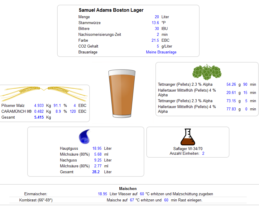 soll einem Samuel Adams Boston Lager gleich kommen: Bei den Hopfengaben bin ich mir mit der Verteilung der IBUs auf Bitter- und Aromaanteile immer unsicher. Wenn ich die verschiedenen Rezepte im Internet vergleiche so erkenne ich, dass es hier gravierende Unterscheide gibt. Ich habe die IBUS nun wie folgt aufgeteilt: Meine Fragen an Euch sind nun: