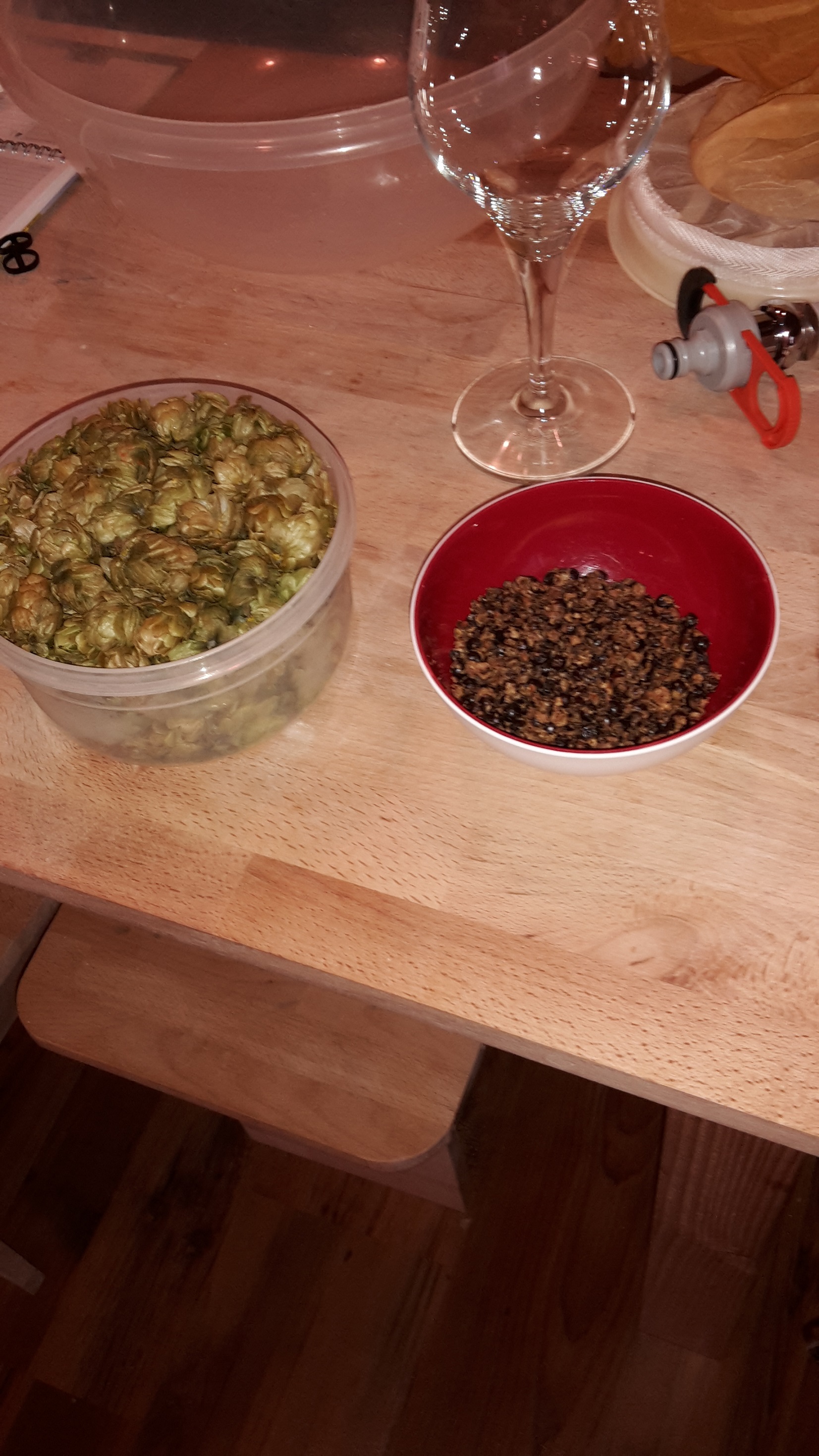 Gestern hab ich meinen eigenen Hopfen aus dem Garten verbraut. Allerdings nur für das Aroma. den Rest muss der Wacholder richten.