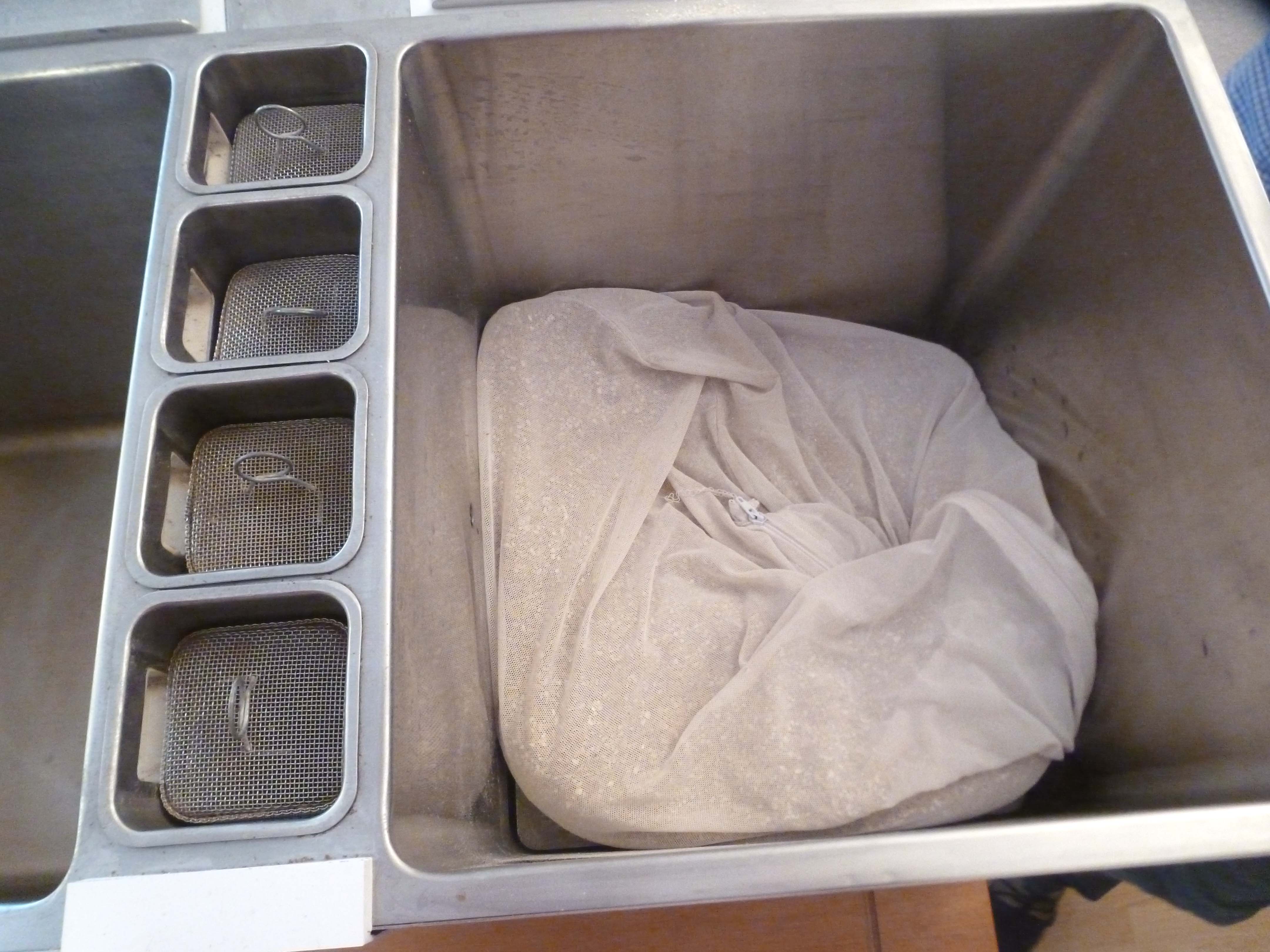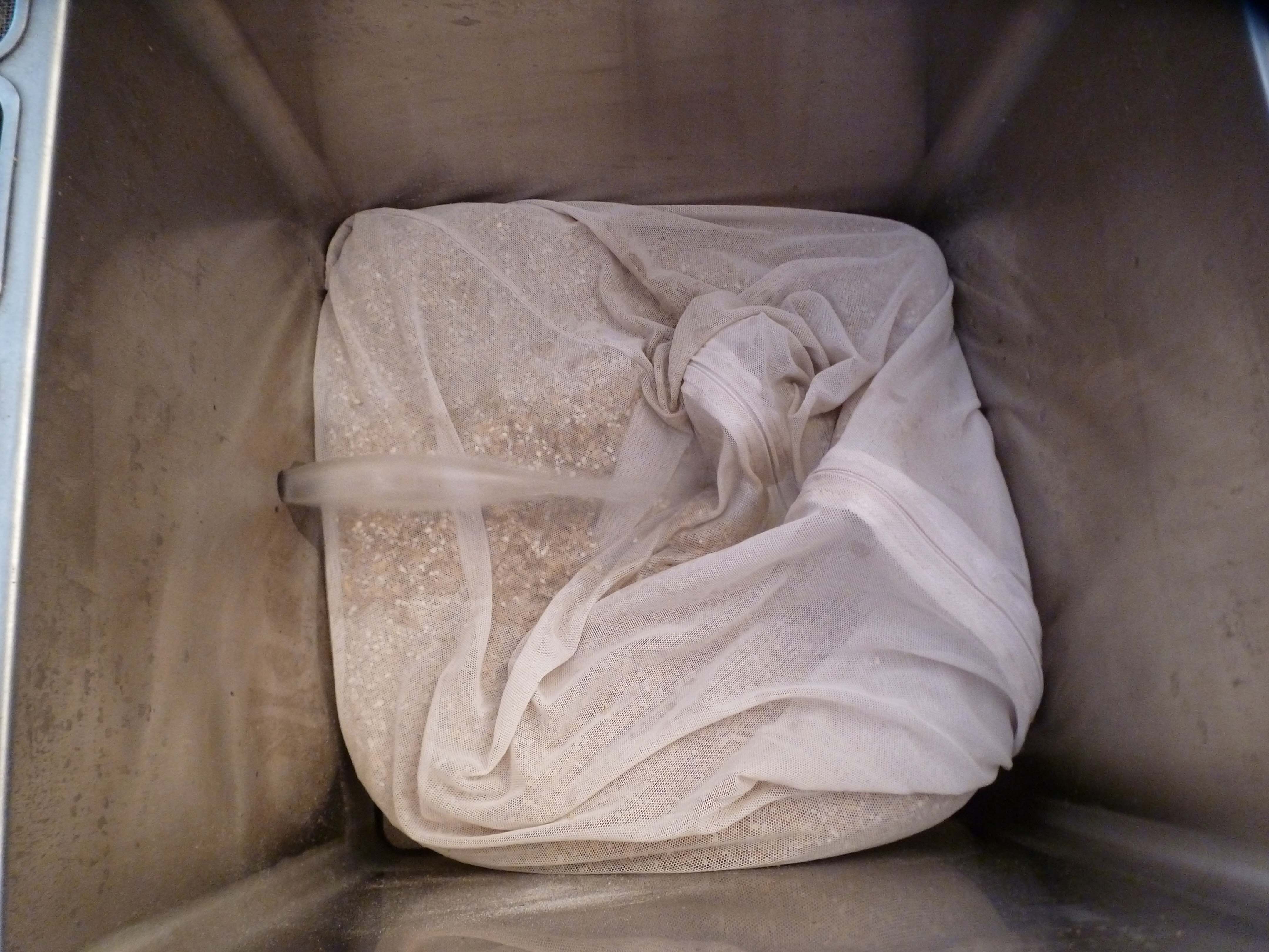 Das Malz wurde aber durch Geschmacksprobe bestätigt sehr gut ausgelaugt, so dass eine von Brewie angegebene SHA von 65% realistisch erscheint. Da eine Teilnehmerin noch was vom Treber mitnehmen wollte, kam es beim Umpacken vom Maischesack in die Tüte dazu, dass etwas davon danebenging. Daher sieht der Brewie innen drin deutlich mit Treber verschmutzt aus.
