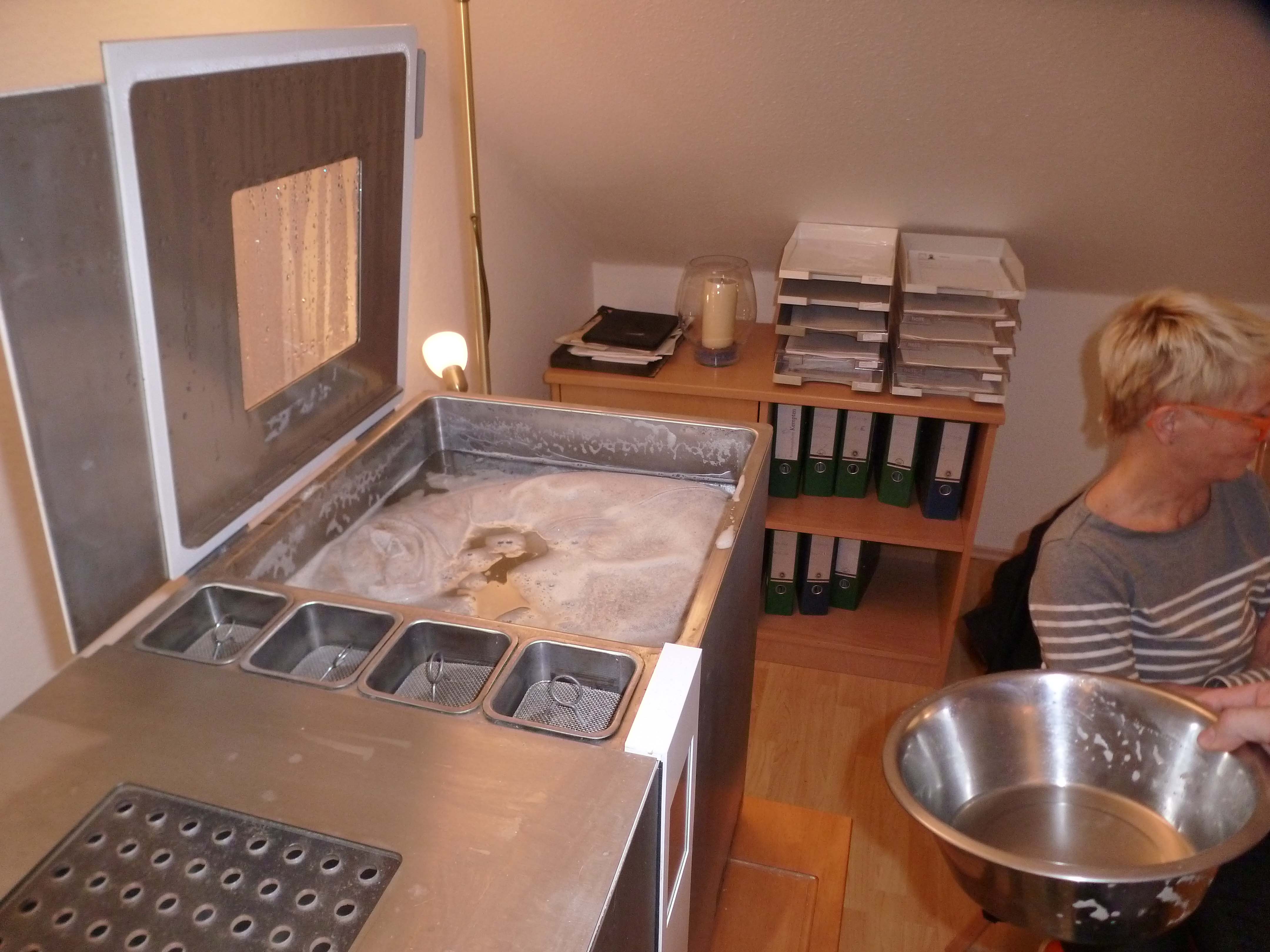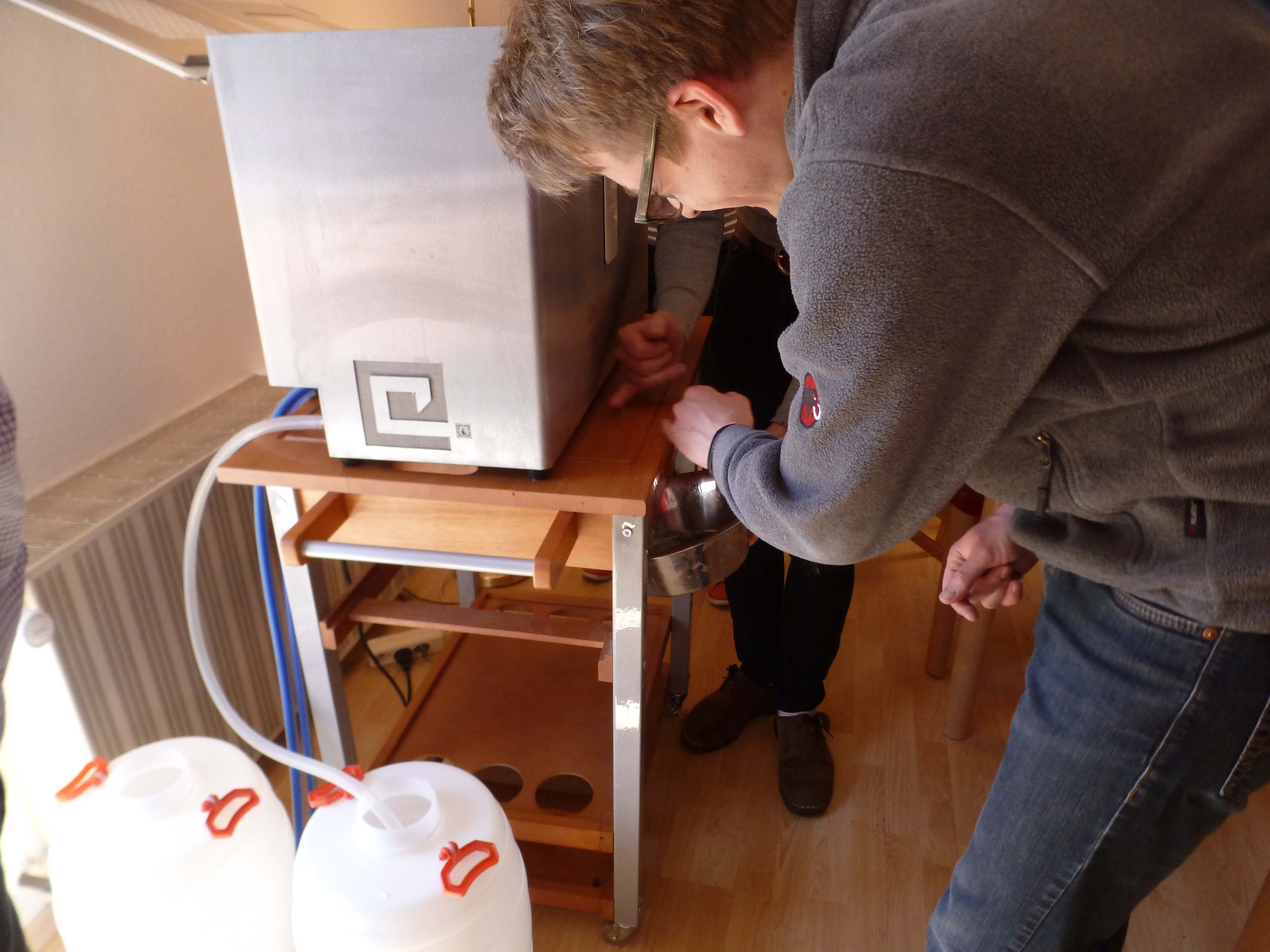 Dann passierts, der Brewie haut urplötzlich die Sicherung meiner Funksteckdose raus. Nachdem er wieder Strom hat, ist es nicht möglich die Schritte im Programm vorwärts zu springen. Dadurch pumpt er viel zu viel Wasser in die Maischekammer. Hier muss Zsolt mit einer großen Schüssel mehrfach mehrere Liter nun stark verwässerter Würze abschöpfen, damit das Gerät nicht überläuft, obgleich beide Kammern eine Waage eingebaut haben, damit der Brewie weiß, wie voll diese sind.
