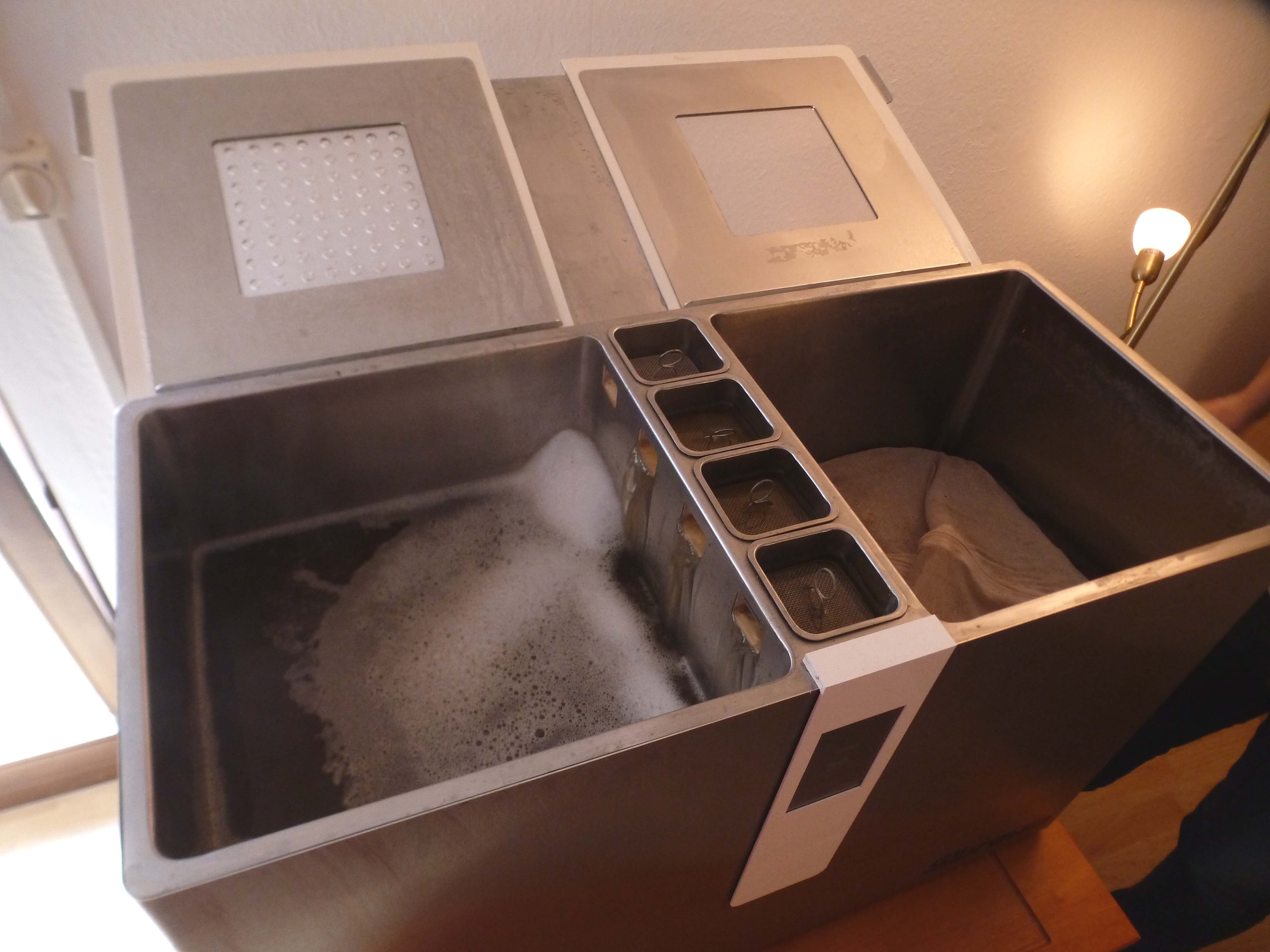 Es ist mein Fehler: in der Vorführung hiess, es ist eine Heizplatte verbaut. Stimmt nicht, es sind 2 Heizplatten, jeweils 2.000 Watt, verbaut, die aber nie gleichzeitig betrieben werden, damit der Strombedarf im üblichen Rahmen bleibt. Also: beide Behälter haben ihre eigene, separat steuerbare Heizung und verfügen über eigene Temperatursensoren.