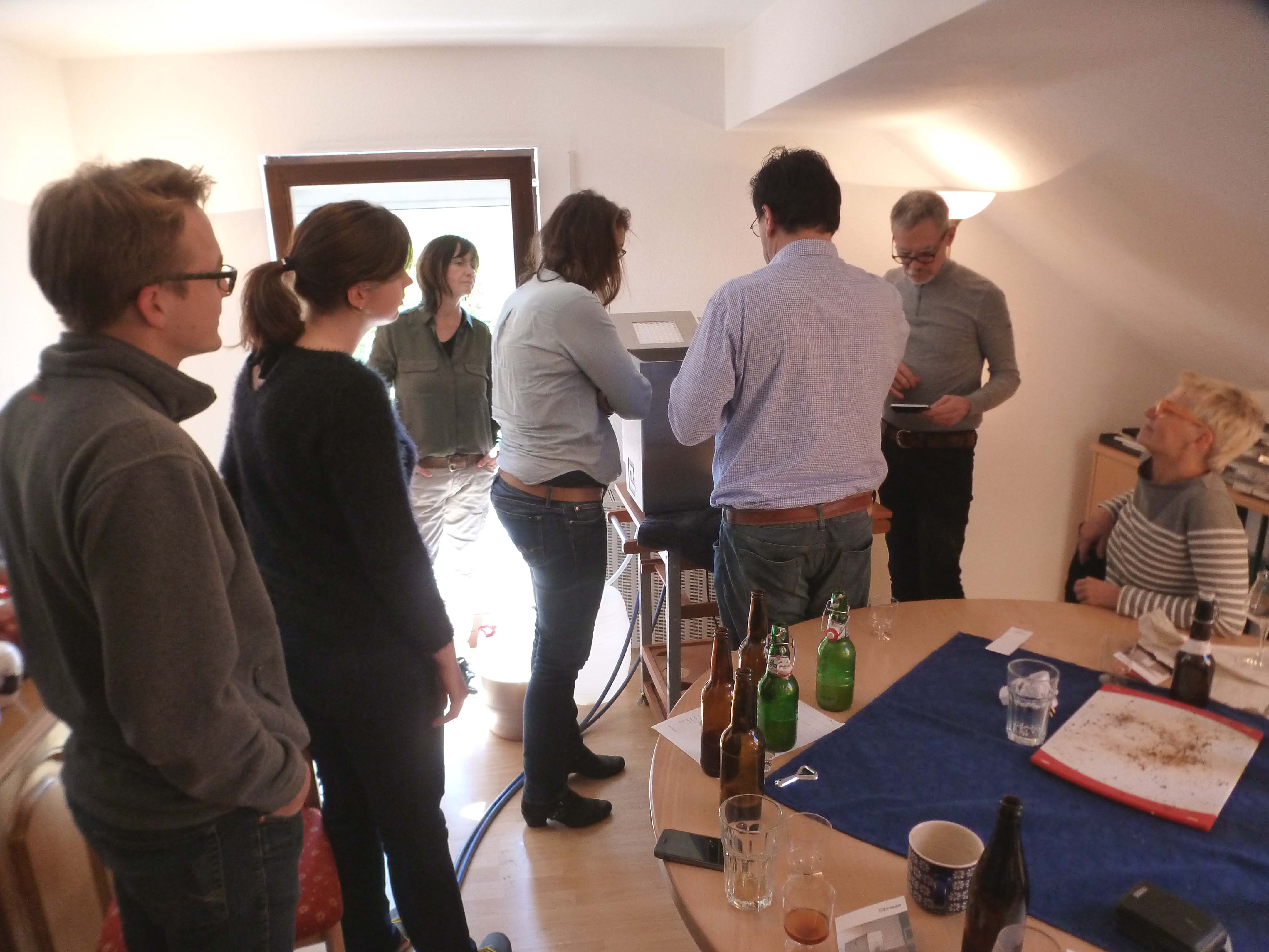 jetzt ist die Brauvorführung vorbei und in kleiner, aber feiner Runde durchlief der Brewie den Test. Es war auch das erste Mal, dass der Brewie zum Schaubrauen in Betrieb war vor Publikum.