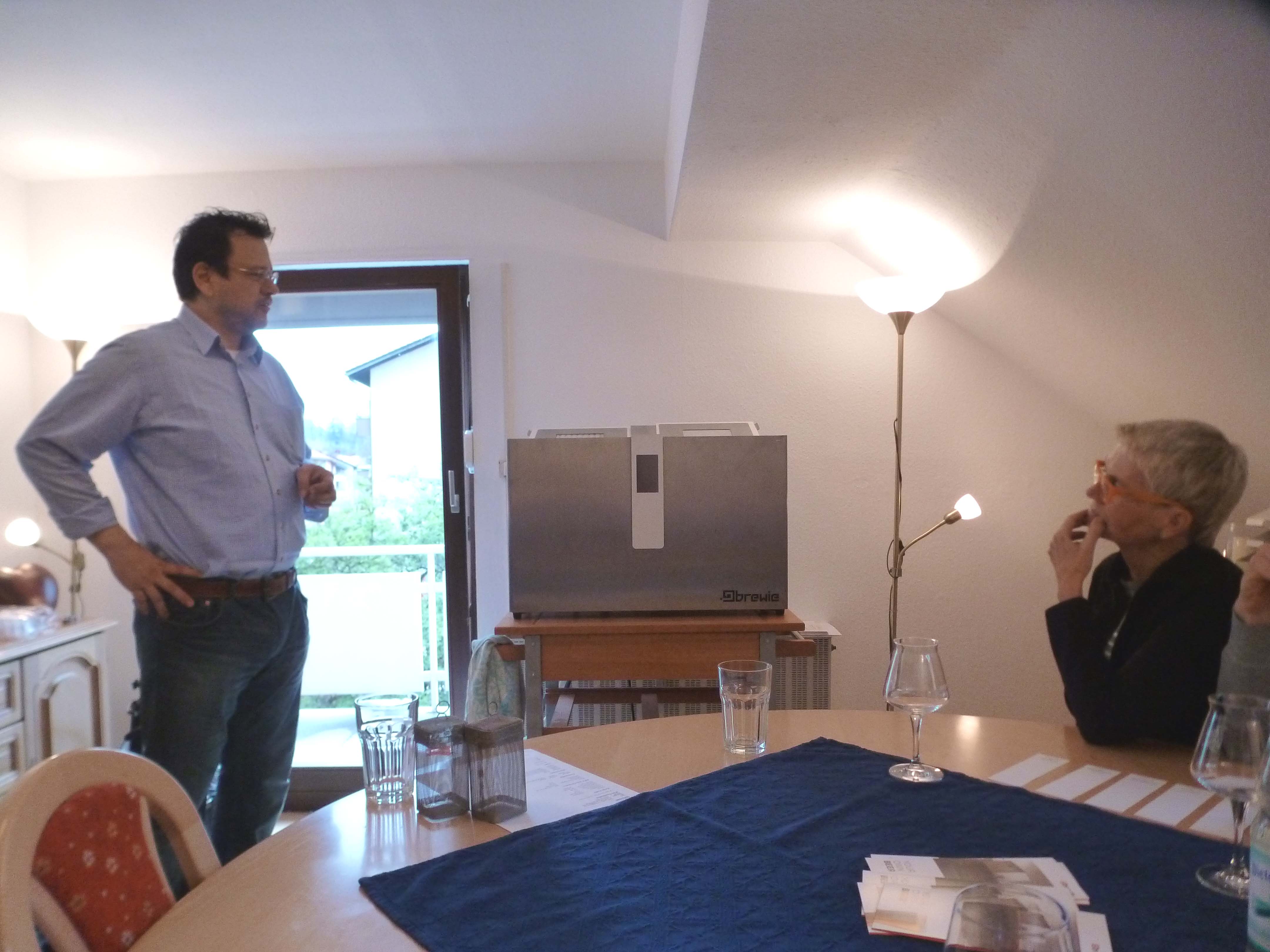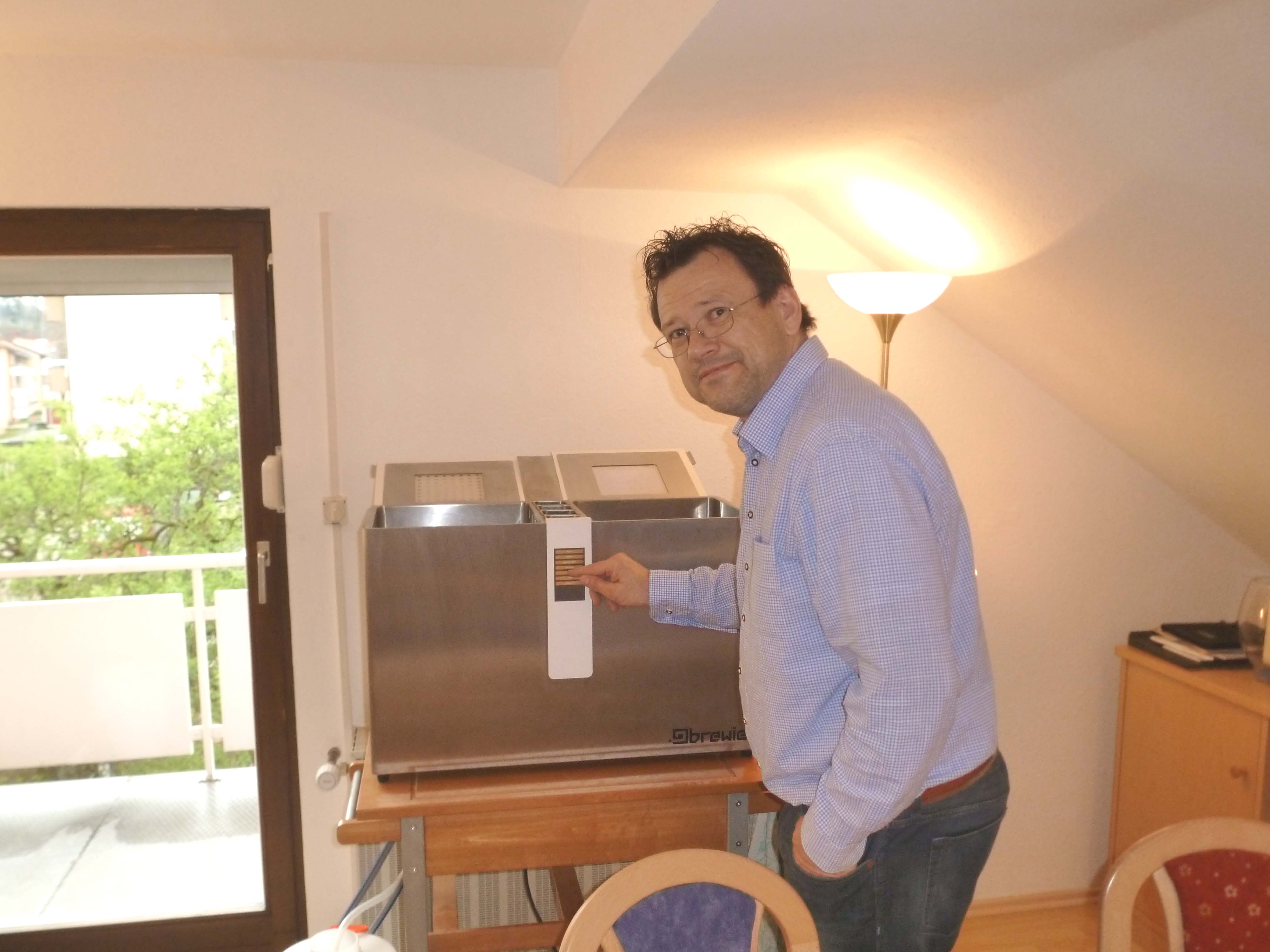 jetzt ist die Brauvorführung vorbei und in kleiner, aber feiner Runde durchlief der Brewie den Test. Es war auch das erste Mal, dass der Brewie zum Schaubrauen in Betrieb war vor Publikum.