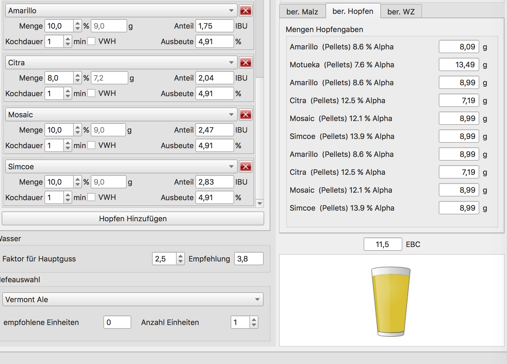 Mit der Zeit wachsen die Ansprüche... ;) Insbesondere für Sude mit Whirlpoolhopfung/"hopbursting"/"hop stand", wäre es toll entweder wie geschrieben die Option bei weiteren Zutaten zu haben oder gleich eine zweite Auswahl im Hopfentab neben der Wahl für "VWH" (zB HB für Whirlpoolhopfung bei 80°C). Ohne dies, ist leider nicht möglich mit einer Nachlaufzeit >0 entsprechende Mengen Hopfen einzutragen. Im Idealfall wäre also bei Wahl von Whirlpoolhopfung, die Hopfenmenge nicht an die IBUs gekoppelt.