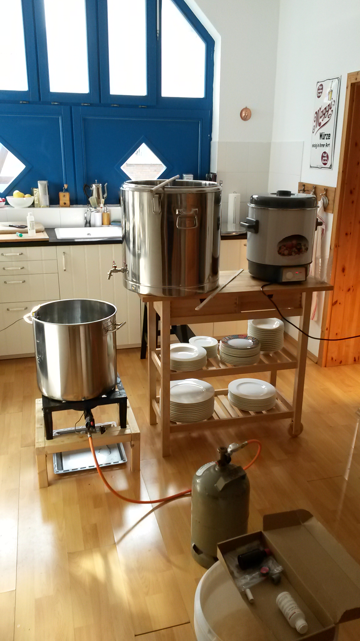 So sieht mein Setup aus: 50L Kessel, 70L TP, Einkocher Nachguss.