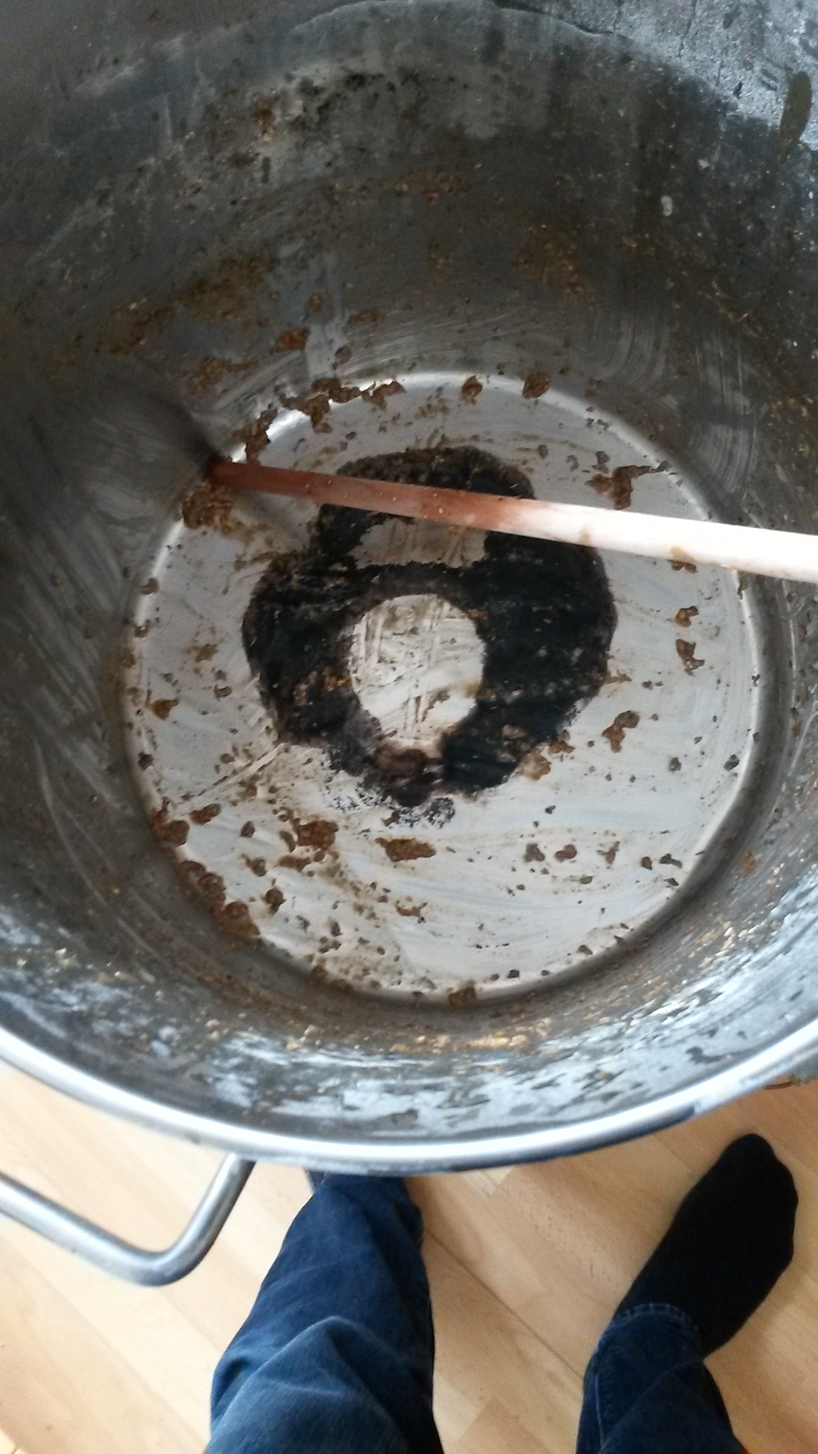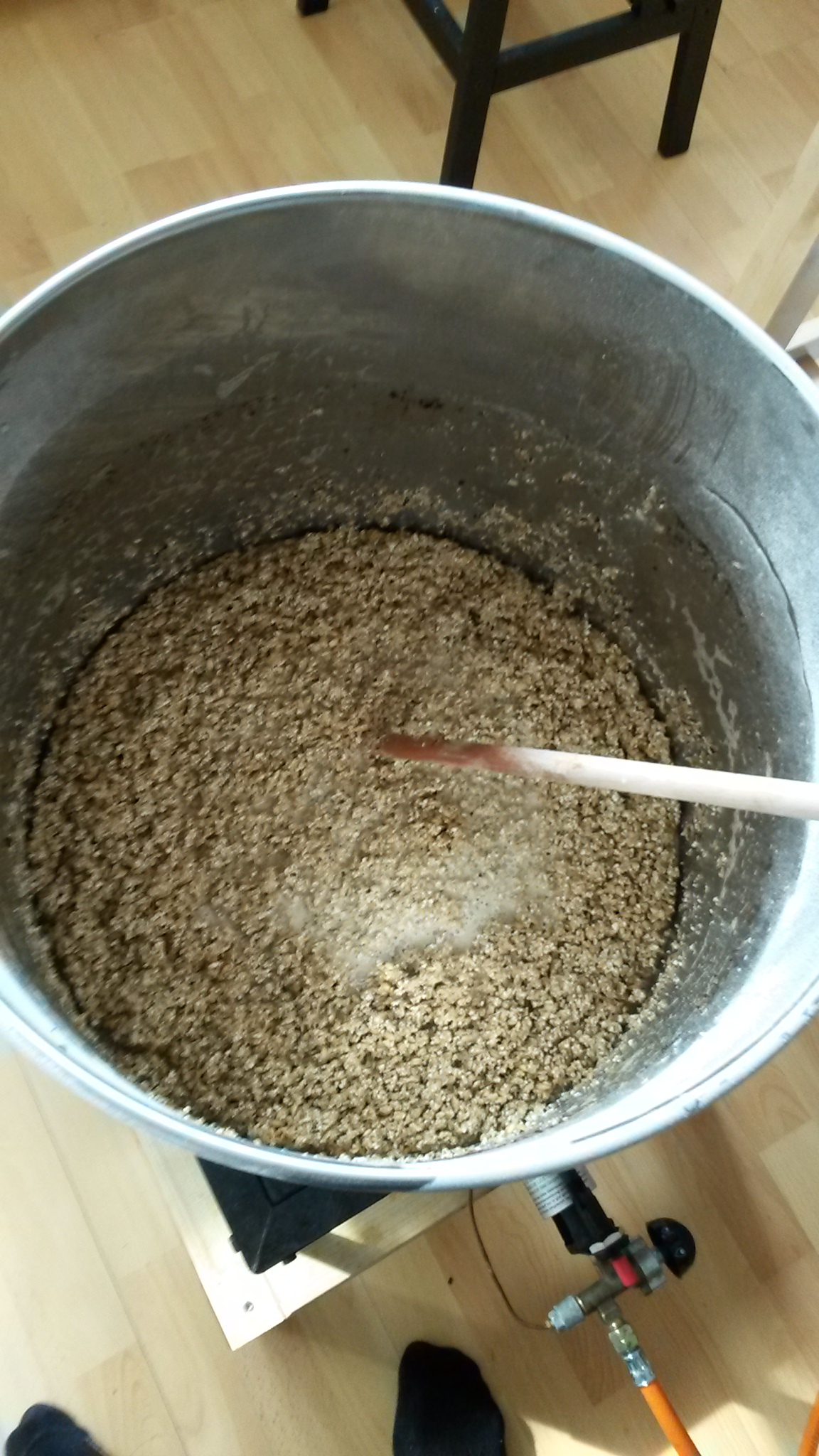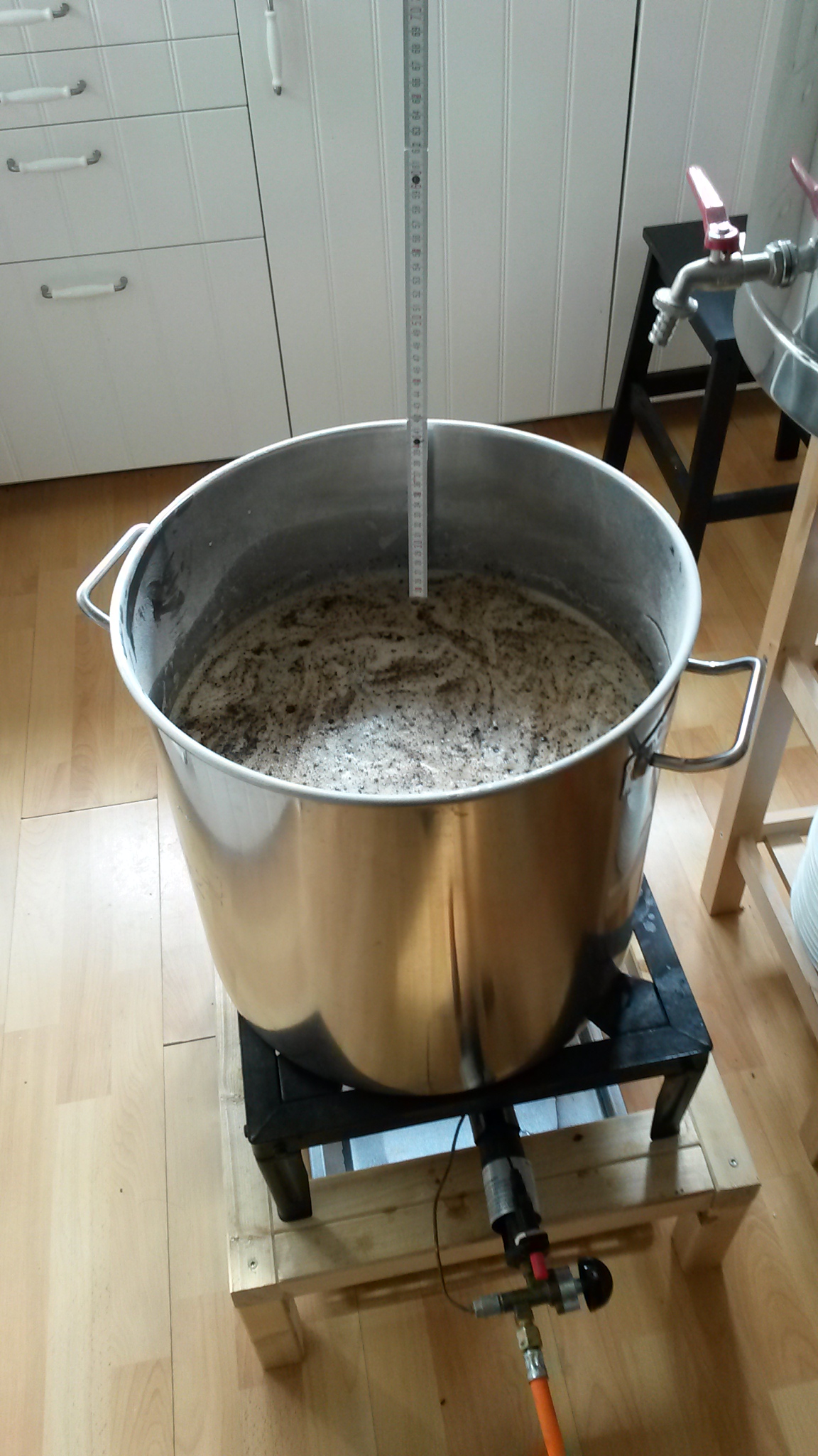 Das war für mich das größte Fragezeichen. Die Dickmaische war dermaßen zähflüssig, dass an Kochen nicht zu denken war. Braten wäre wahrscheinlicher gewesen... Dehalb Zugabe von >2Litern Wasser.