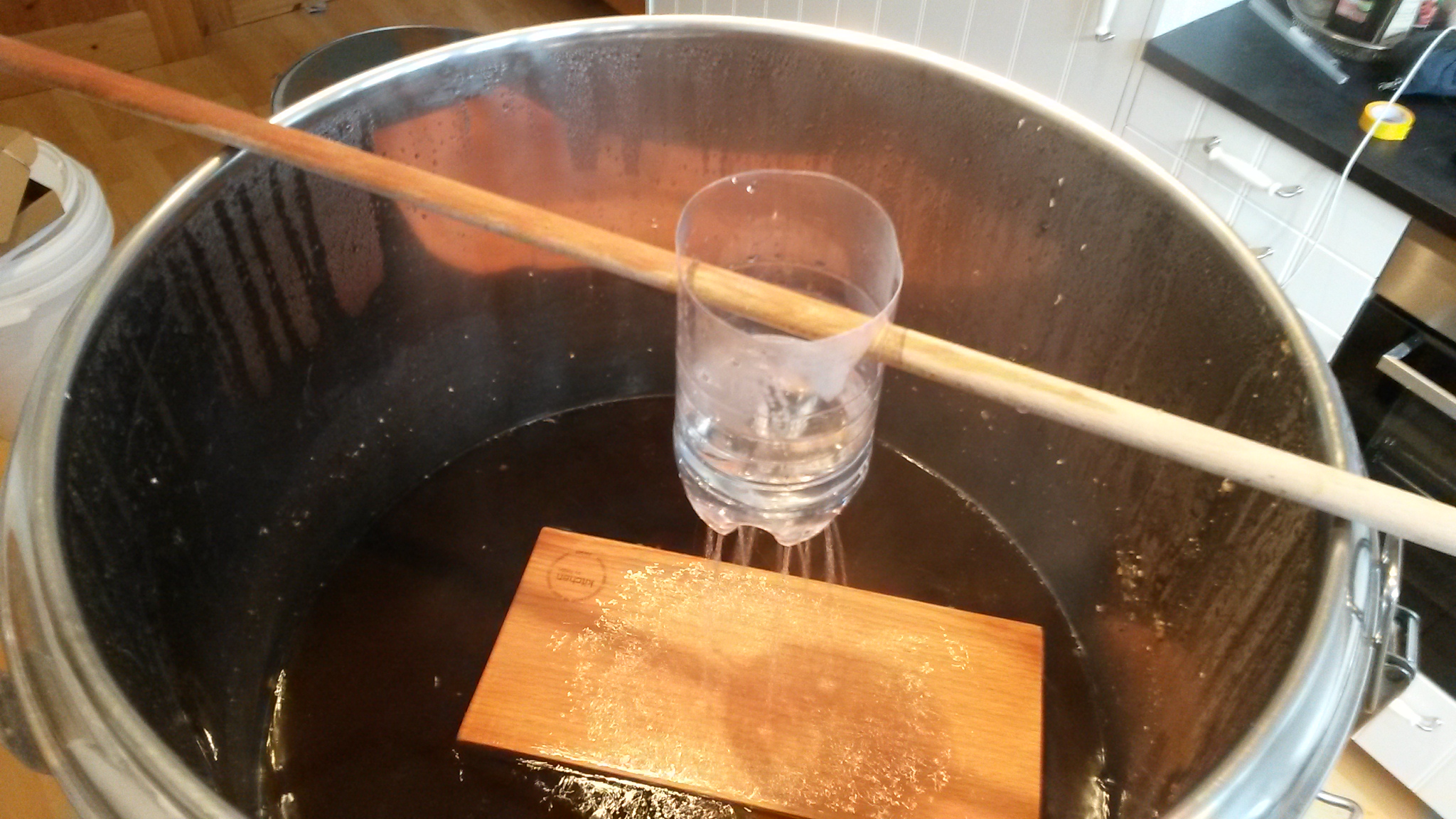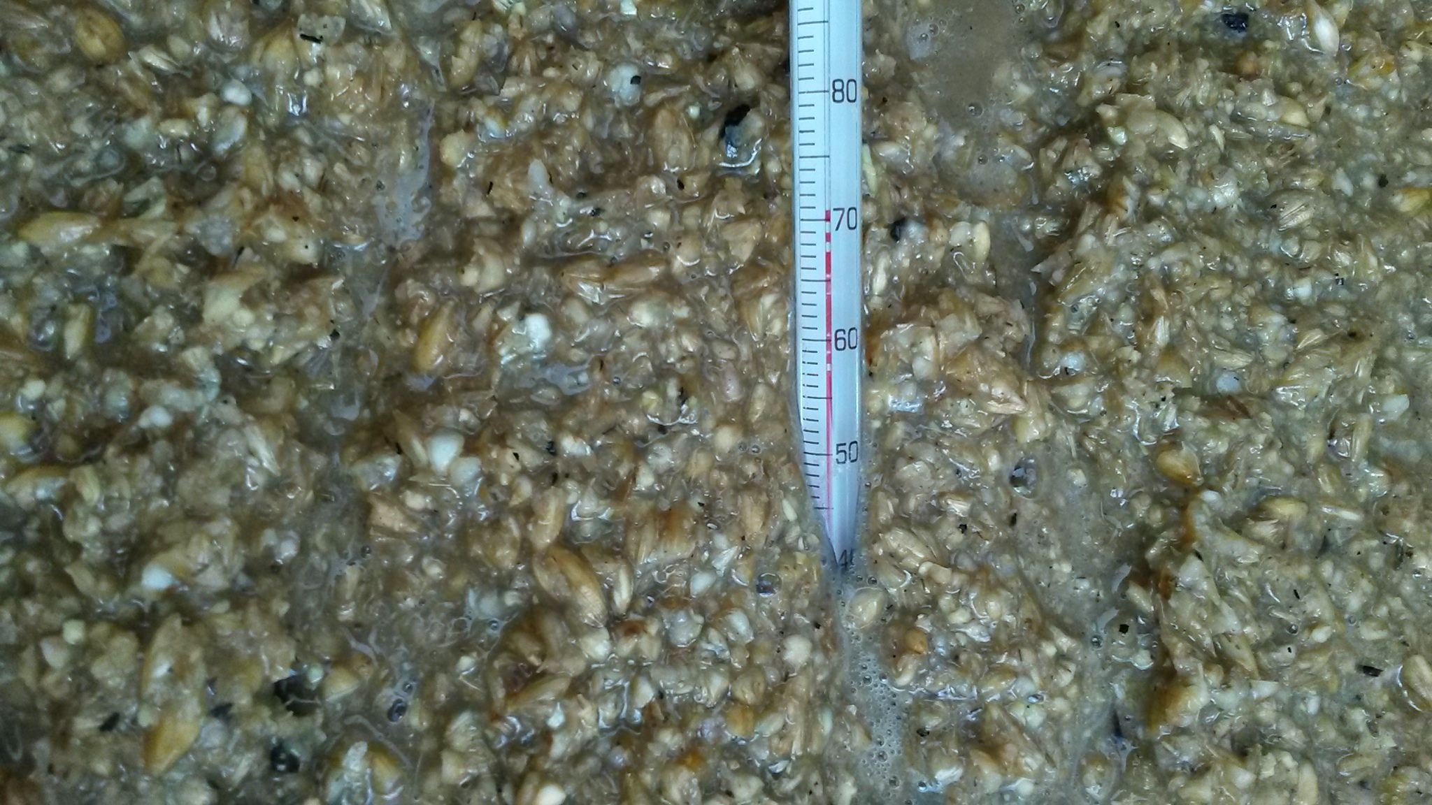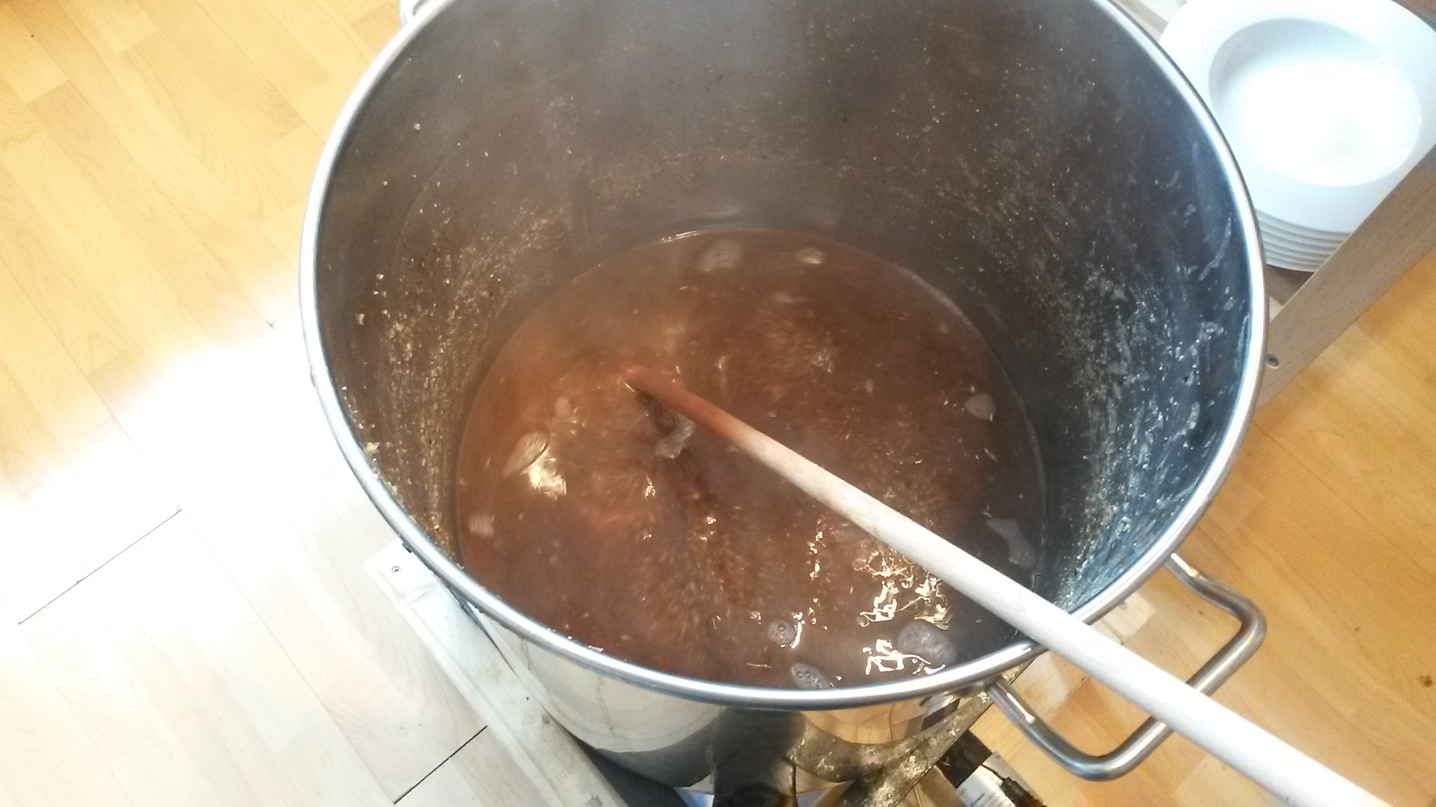 Das war für mich das größte Fragezeichen. Die Dickmaische war dermaßen zähflüssig, dass an Kochen nicht zu denken war. Braten wäre wahrscheinlicher gewesen... Dehalb Zugabe von >2Litern Wasser.