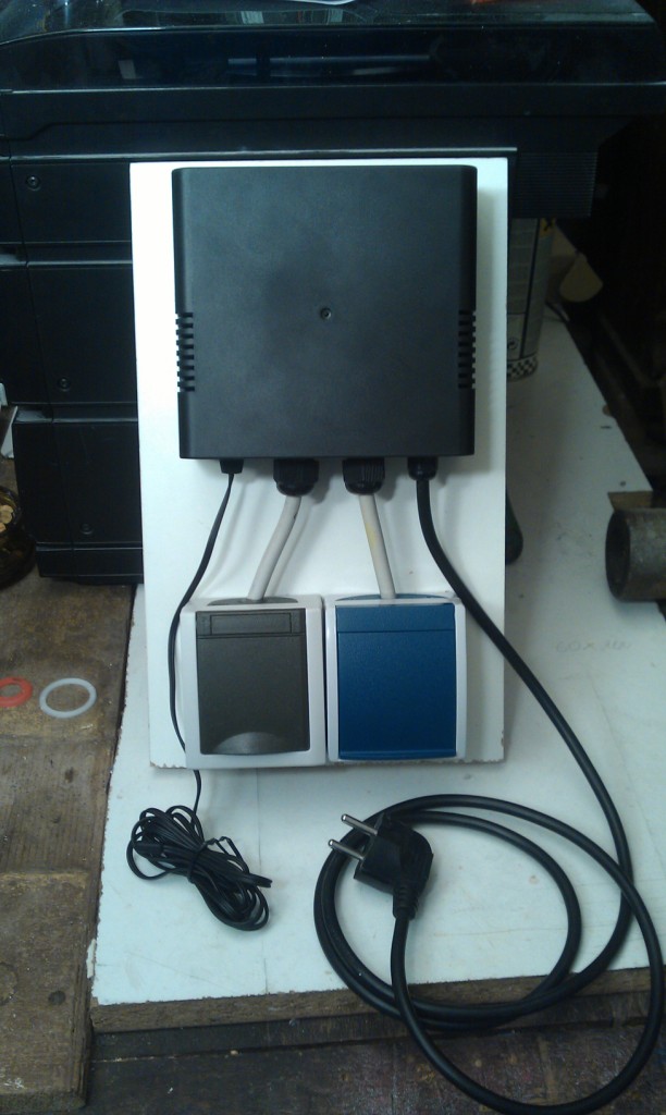 An die beiden Relais für Heizung und Kühlung habe ich jeweils eine Aufputz-Steckdose angeklemmt und das ganze auf ein Holzbrett montiert.