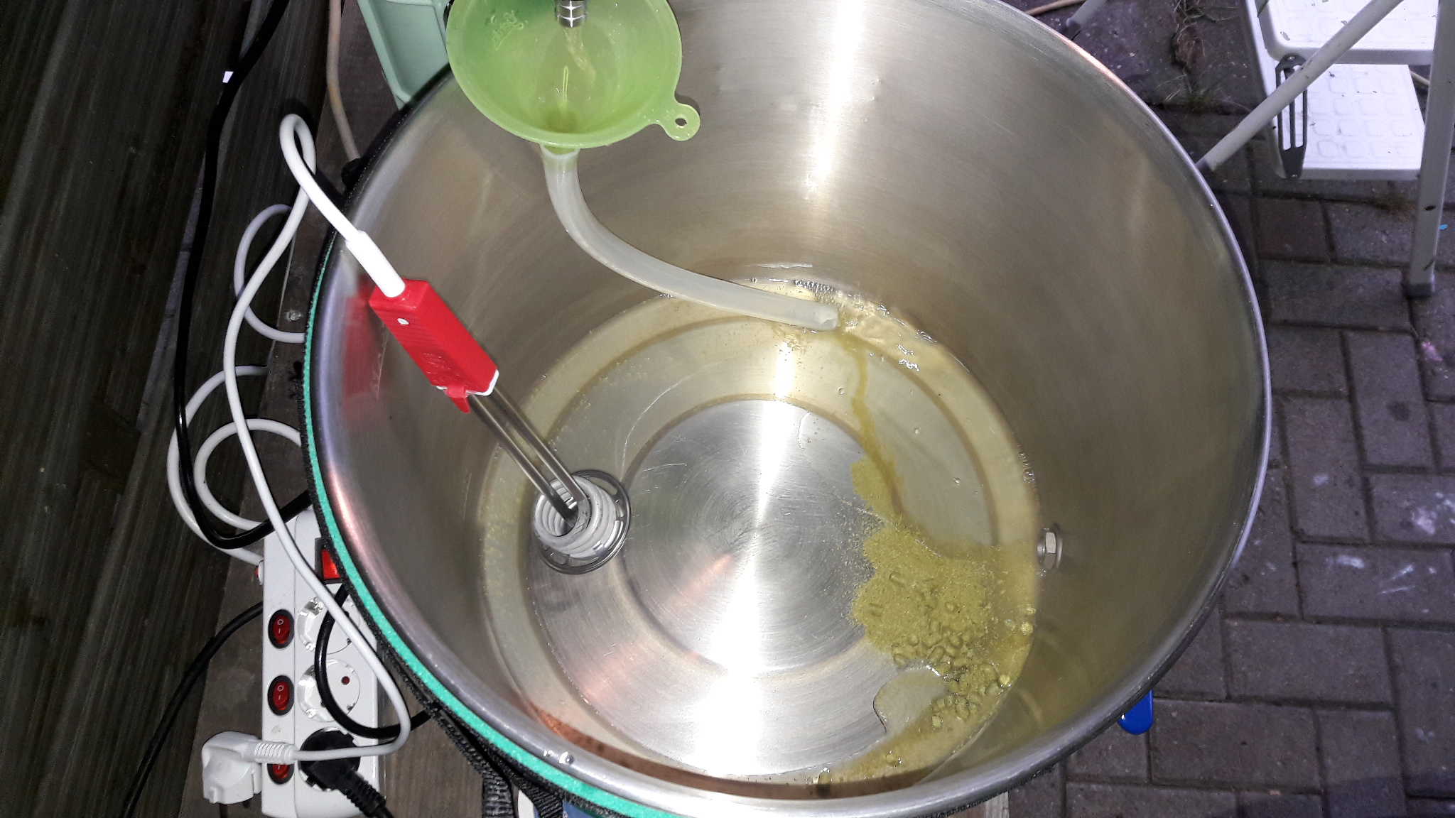Probe für Stammwürze entnommen, abgekühlt auf <80°C, und Whirlpool angedreht, abwarten.