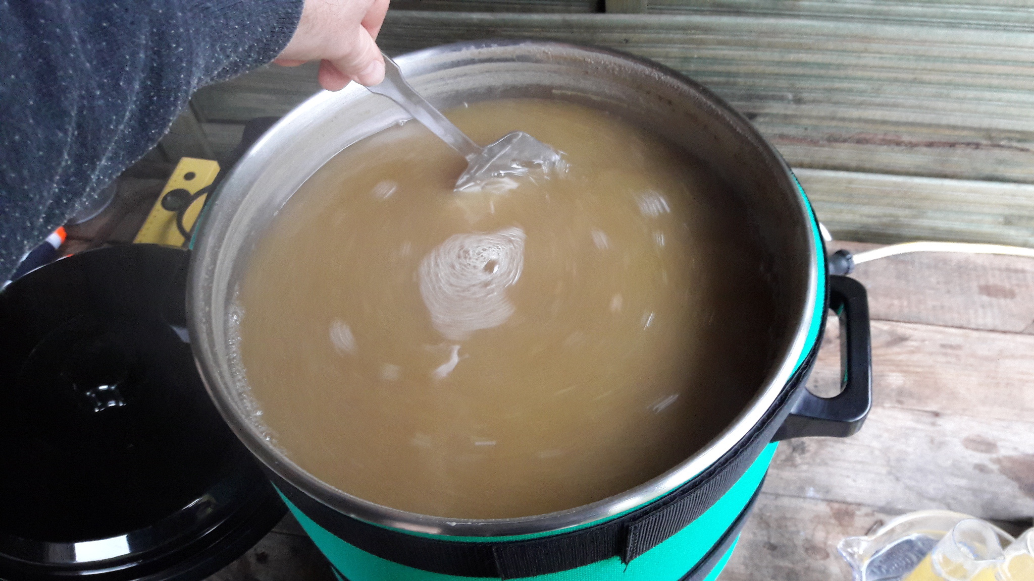 Probe für Stammwürze entnommen, abgekühlt auf <80°C, und Whirlpool angedreht, abwarten.