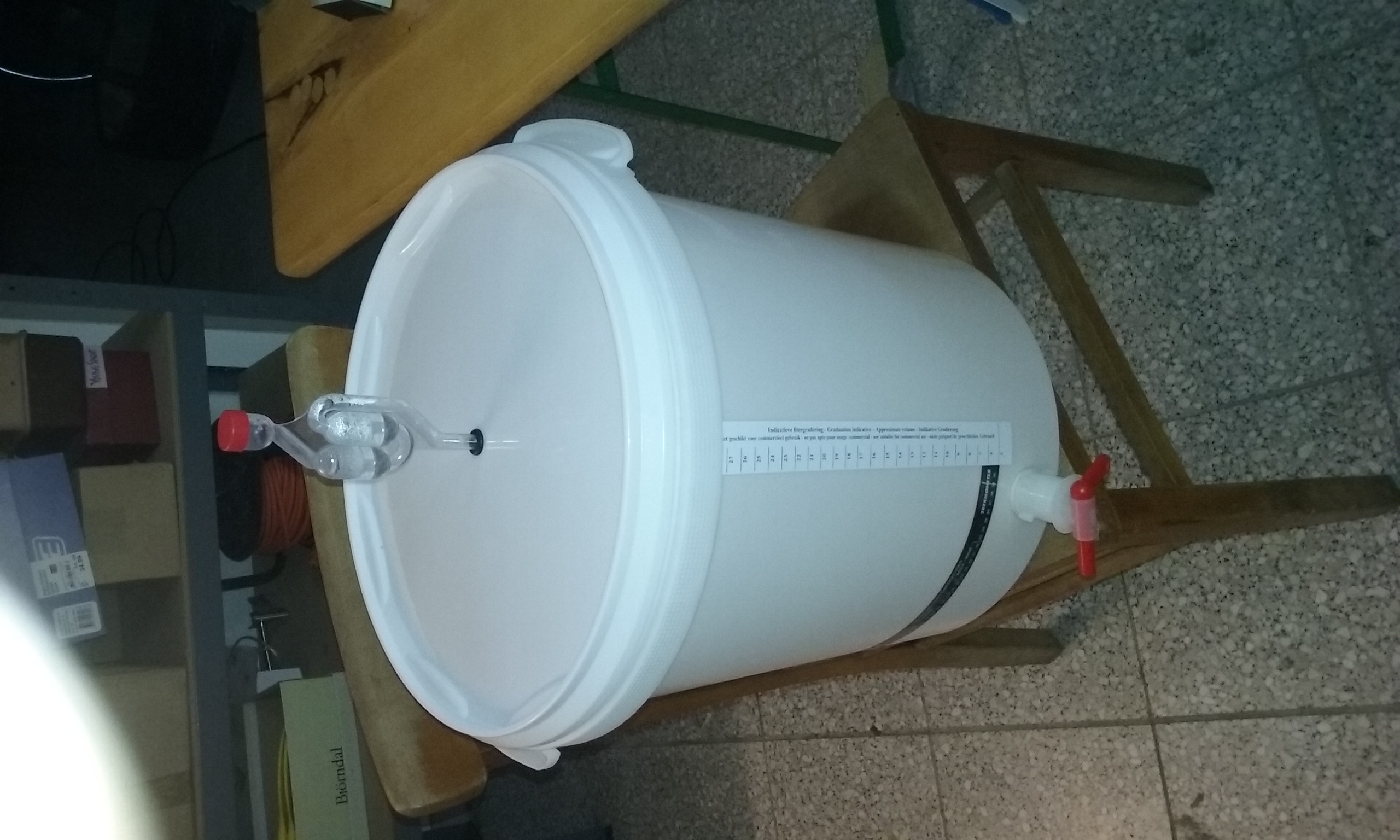 Dann Sack aus dem Einkocher herausgehoben und über ein Gitter kurz auslaufen lassen in den Einkocher, dann den Sack in das Nachgusswasser 9,5 Liter und ausgespült sowie ausgepresst. Dazwischen wurde weiter aufgeheizt zum Hopfenkochen. Hopfenseihen, Kühlen über Nacht, Am nächsten Tag 01.11.2016 wurde angestellt mit der Safale S04.