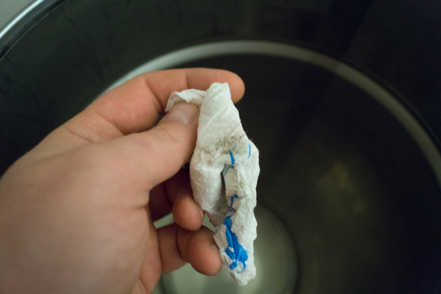 Wenn mann jetzt mit einem Haushaltstuch darüber wischt, bleiben graubraune Rückstände daran haften. Was könnte das sein? Bierstein? Hopfenrückstände?