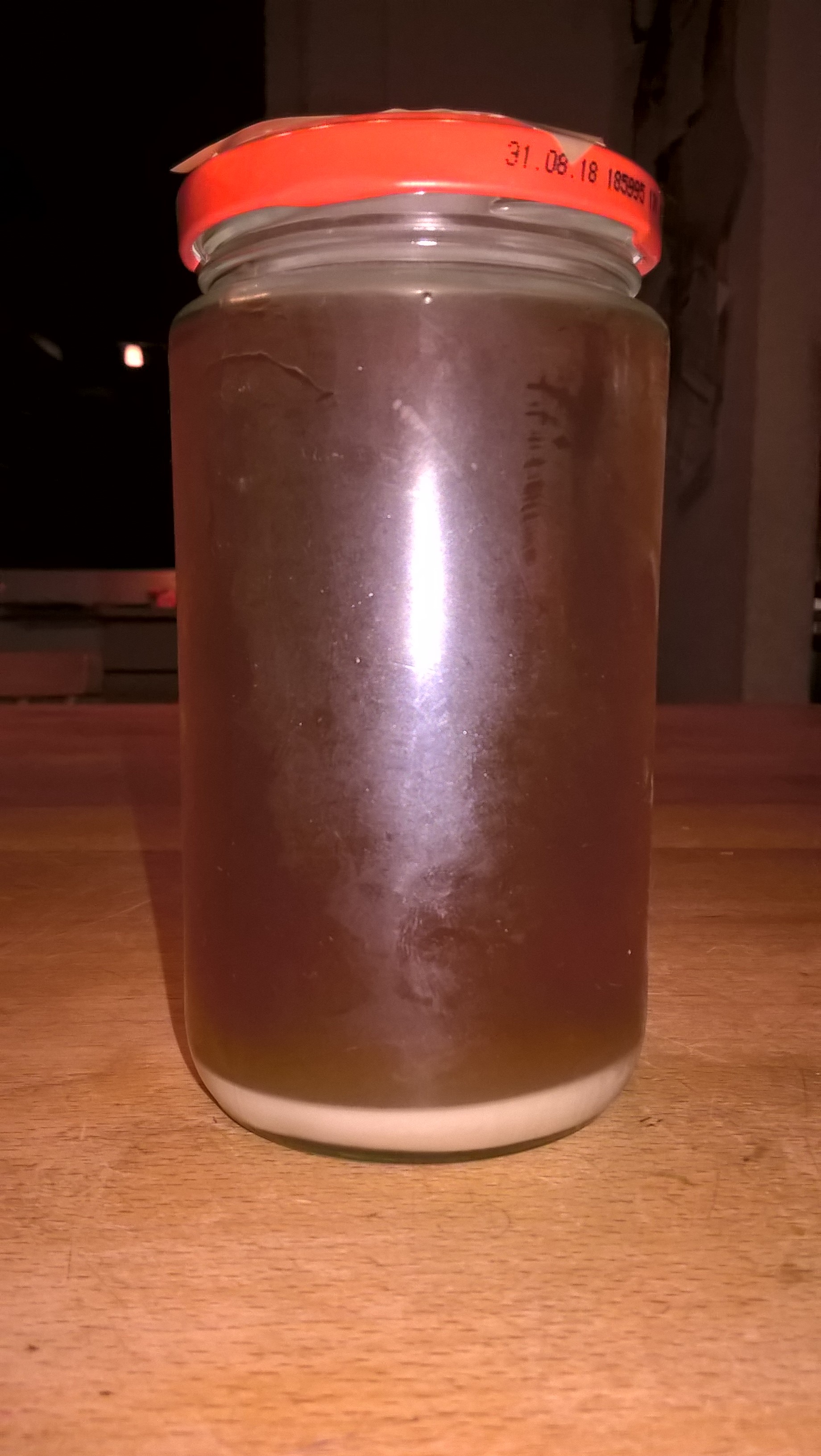 Die Überraschung war da, als ich die Hefe für den Starter aus dem Einweckglas genommen habe. Die Konsistens der Hefe war nicht wie sonst üblich cremig sondern gallertartig, aber fester. Beim "Rauslöffeln" ist die Hefe in grobe Bruchstücke "zerfallen". Hat mich irgendwie an diese wackelpuddingmäßige Masse erinnert, die beim Käsemachen entsteht - nur eben viel fester. Die Hefe hat richtig am Löffel geklebt.