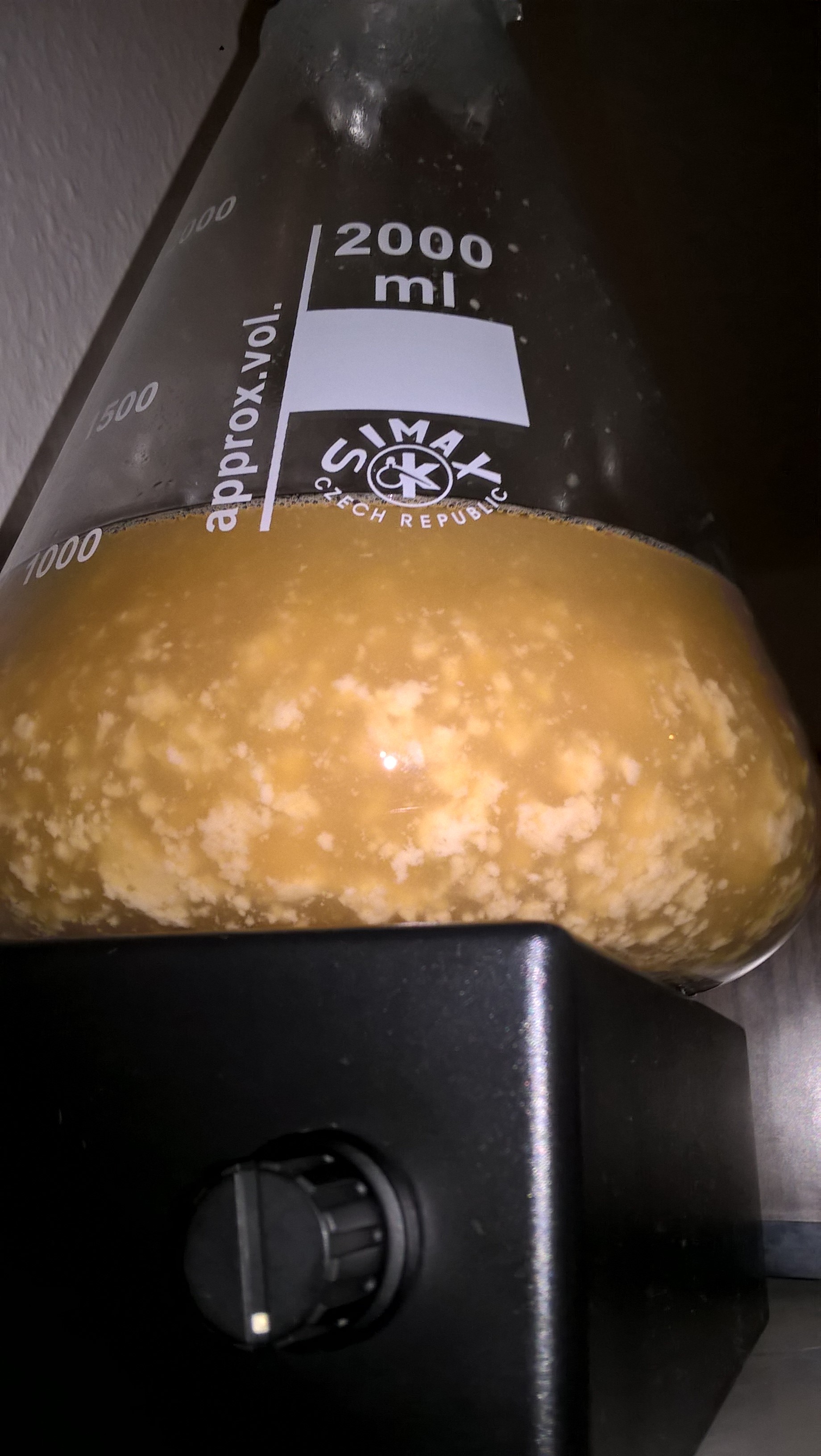Ich habe aus Neugier jetzt trotzdem mit dieser Hefe den Starter angestellt. Einfach mal um zu sehen, was passiert. Die Hefe hat sich auch ordentlich "vermehrt", siehe Foto #2 nach 24 h. Das Foto #2 ist aufgenommen nachdem ich den Kolben für 5 min vom Magnetrührer genommen habe. Die Hefe bildet sofort "Konglomerate" und sinkt zu Boden. Üblicherweise bildet sich nach 5 min nicht so eine saubere Hefeschicht am Boden. Ich habe noch ein weiteres Foto gemacht (Foto #3), was den Kolben zeigt, nachdem ich den Magnetrührer wieder angestellt habe. Da sieht man sehr schön die Klumpenbildung.