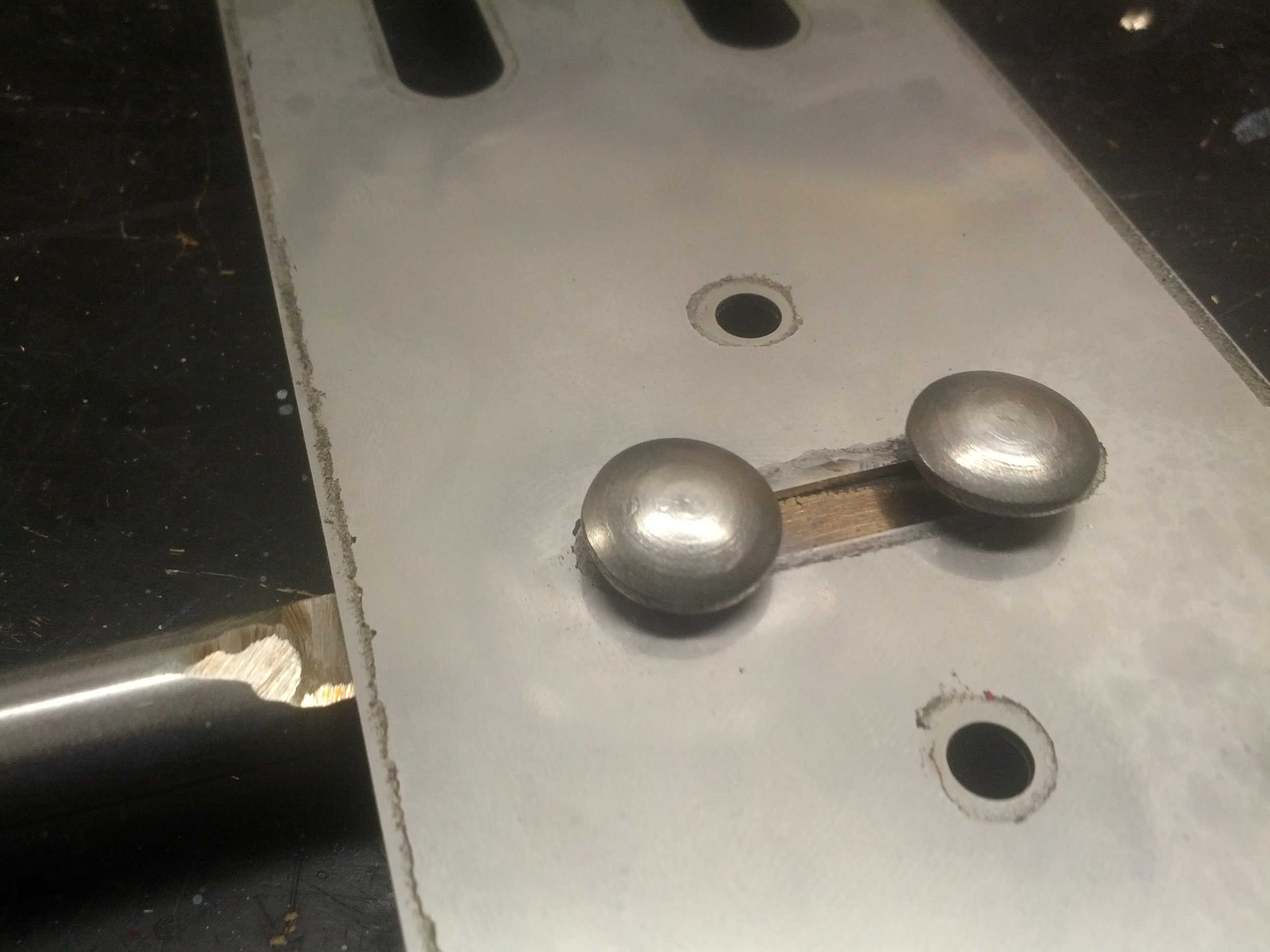 Das Quirlblech wird mit Schlossschrauben an der Welle gehalten. Das nächste mal werden die Löcher mittiger und gerader (versprochen!)