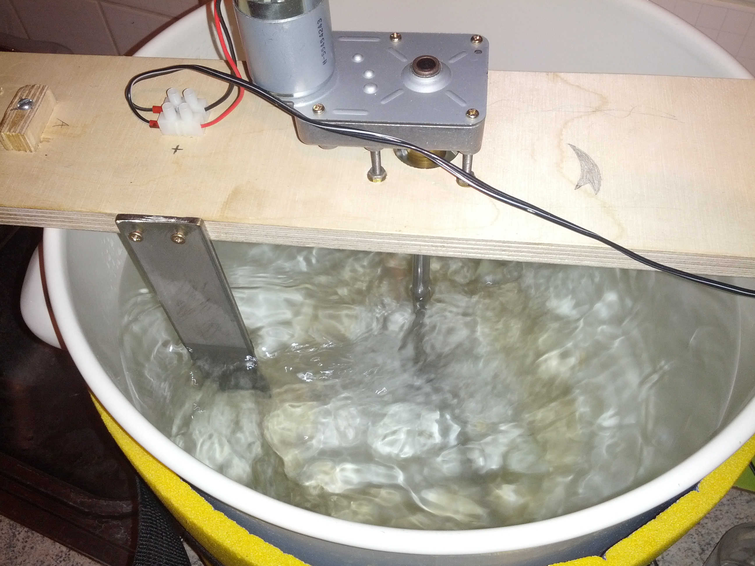 Rührwerk in Aktion, leider durch die Verwirbelungen an der Wasseroberfläche nicht so richtig gut erkennbar.