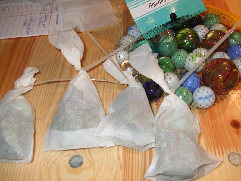 Als weiteres fand ich beim DM Teebeutel zum Selbstbefüllen. Diese Teebeutel habe ich frei Schnauze ca. mit 20 g Mandarina und einer größeren Glasmurmel versehen und mit Kabelbinder verschlossen.
