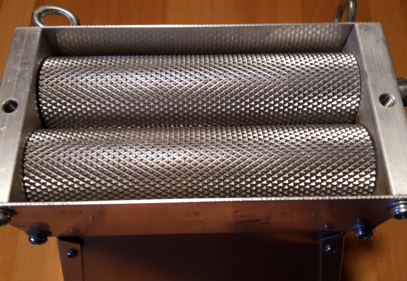 Zu meiner Polsinelli Anlage 100L habe ich auch die 2 Walzenmühle inklusive. mitgelieferten Trichter gekauft. Ich habe auch noch nie mit der Hand gekurbelt, sondern immer mit dem Akkuschrauber oder Bohrmaschine 15 bis 20 Kg Malz durchgeknattert je Brauvorgang. Die Verstellung der Walzen ist schon mal schön zu haben, die Einstellung ist dann eher ein wenig ein Gepfriemel und Hintasten. Wenn dann die Einstellung gefunden ist, geht's aber auch schon mächtig los. Ich lasse meine Antriebsmaschinen mit ca. 200 bis 300 Umdrehungen laufen, ansonsten staubt es mir zu sehr. Es geht wirklich schnell vorwärts, von wegen am Vorabend schrotten, ist absolut Geschichte. Zwischen Tür und Angel sind 15 Kg durch. Das Abwiegen vom Malz dauert länger. Natürlich ist das keine Meisterarbeit. Aber Preis und Leistung passen. Mehr Anforderung an das Gehäuse sind nicht vonnöten. Die Walzen sind auch nicht weich wie man schon manchmal lesen konnte. Selbst wenn, Eisen gegen Malz, wer wird das für sich entscheiden? Die Rändelung auf den Walzen ist nitriert, also der Kern der Walzen ist eisenhart, die Oberläche ist nur 0,2 bis 0,3mm tief gehärtet. Und das ist genau richtig so, damit läuft man auch keine Gefahr der Durchärtung die auf verschiedenste Einflüsse zu brechen drohen könnte, bzw durch Spannungsrisse zum Totalverlust führen könnte. Der mitgelieferte Trichter ist optimal ausgelegt für die Grösse und Kapazität der Mühle. Ohne Zweifel, man könnte besser bauen, ist das für den Hobbybrauer notwendig?