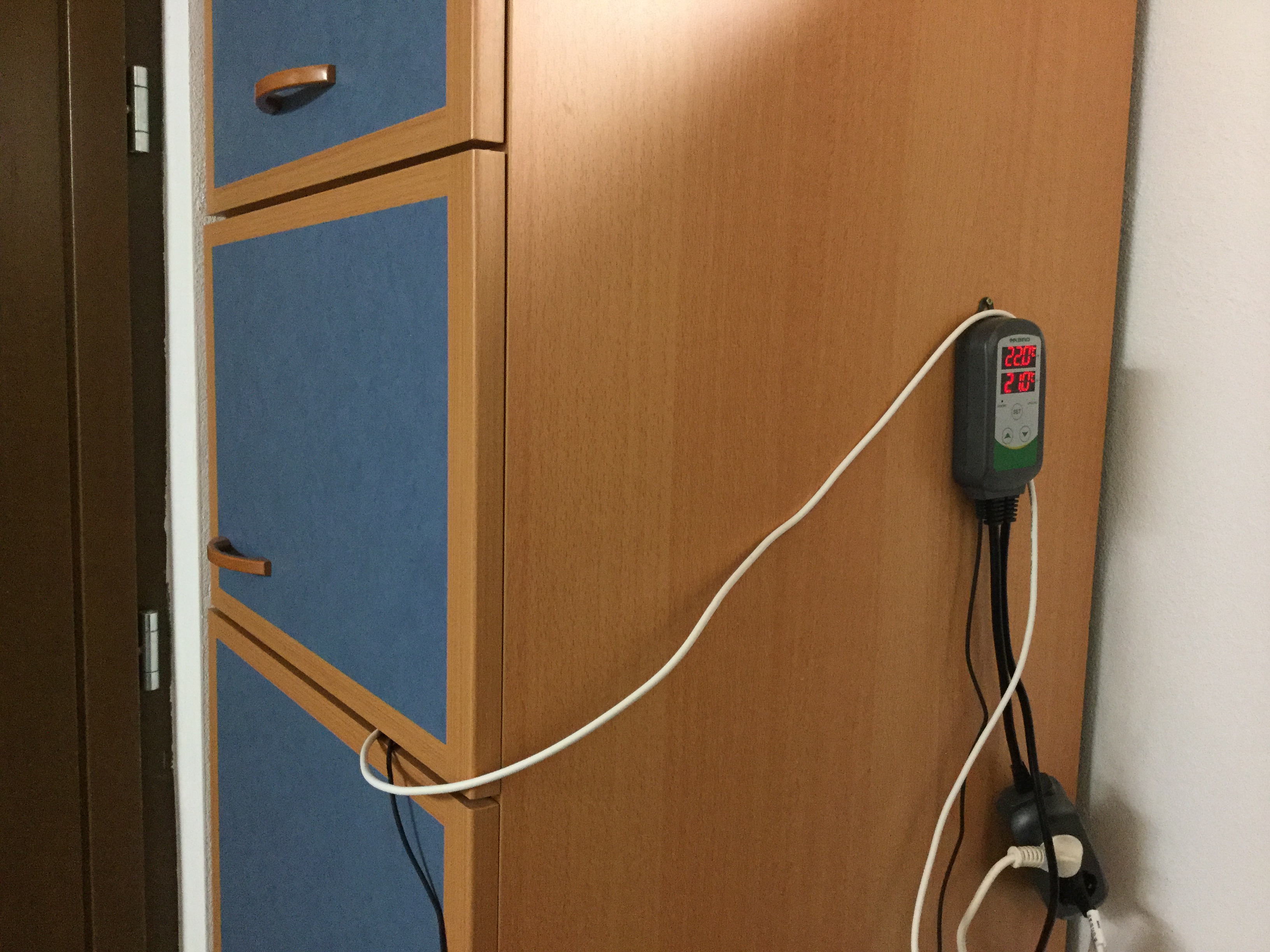 Ich vergäre in einem alten Kühlschrank, dessen Temperatur ich mit einem Inkbird ITC-308 steuere. Ist es zu warm, schaltet der Kühlschrank ein. Ist es zu kalt, heizt eine Terrarium-Matte, die im ausgeräumte Gemüsefach liegt.