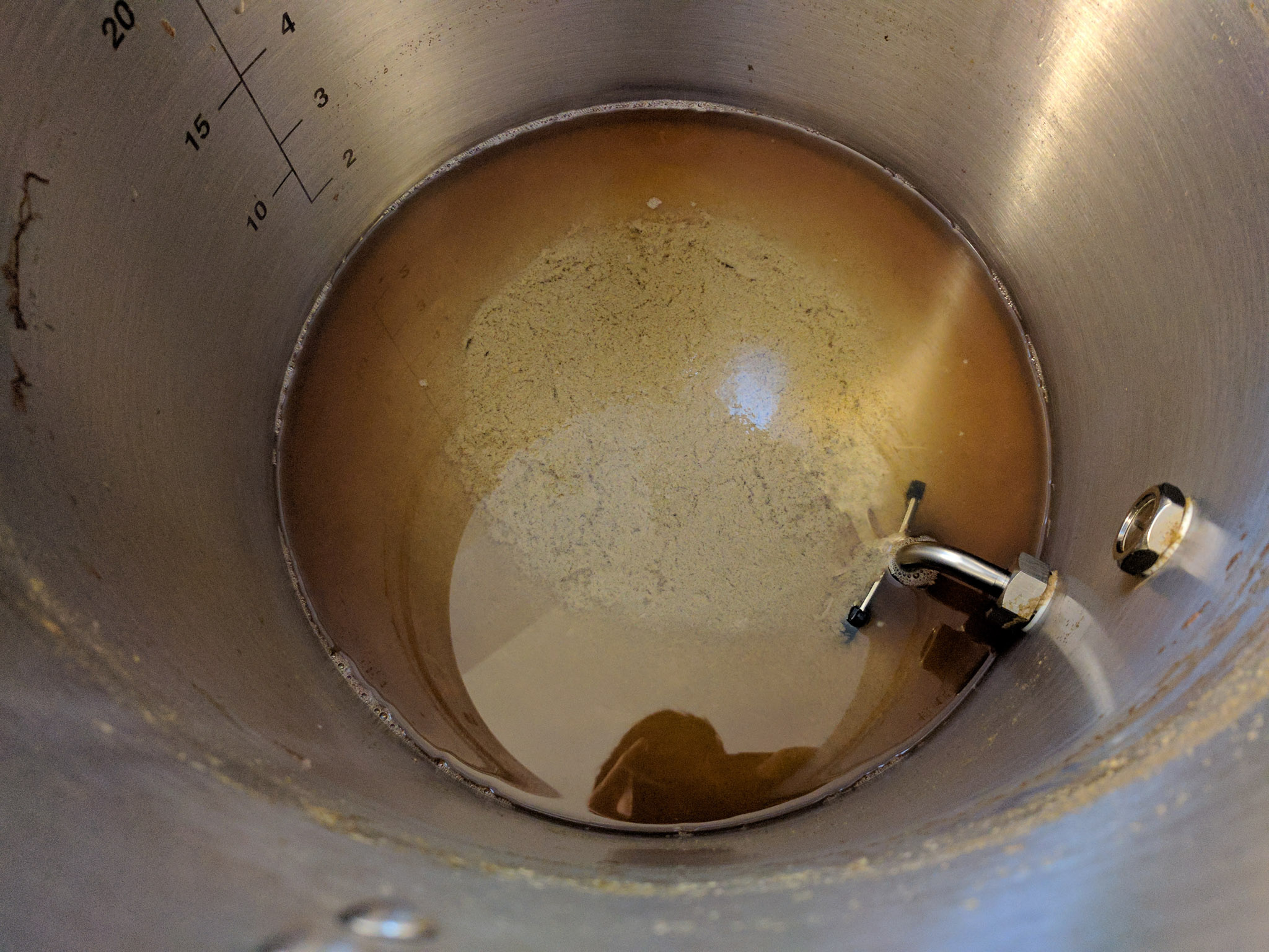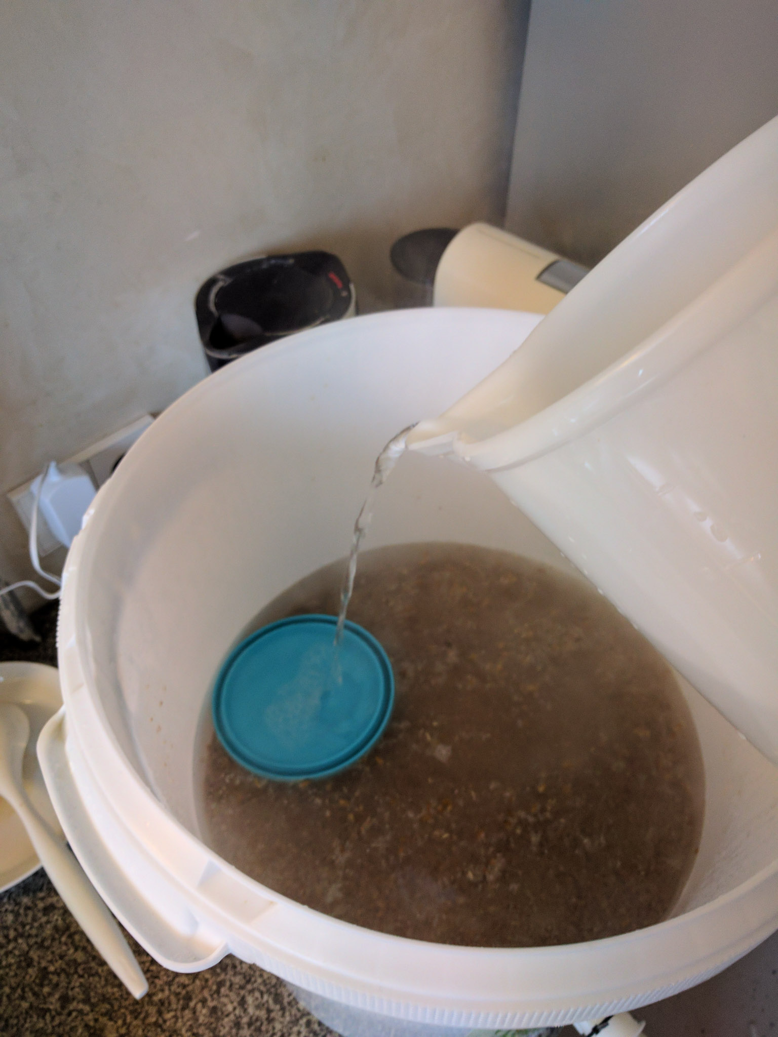 Magier-Fix Mischung für Weißbier: Einmaischen im 38l Ss Brewtech Kettle: Läuterblech und Eimer bereit, Absperrhahn geschlossen (mein liebster Braufehler: Hähne offenlassen) Sieht einigermaßen normal aus: Computer sagt "Abmaischen": Umschöpfen mit dem Meßbecher in den Läutereimer (oben links baumelt der Raspi): Ich habe diesmal in einen zweiten Eimer geläutert und dann zwei mal umgeschüttet, so konnte der Kessel parallel schon mal kräftig heizen. Sowieso ist die Aufheizrate von meinem Gasherd ganz ordentlich. Nachgüsse auf Schwimmer: Hopfenkochen (meiner neuer Topf hat schön Luft nach oben, das erspart die Angst vorm Überkochen) Braufehler Nr. 1: Trubdamm (sollte jetzt eigentlich im Topf stecken
