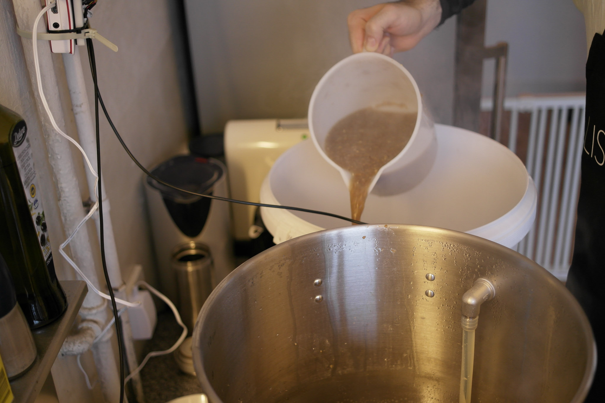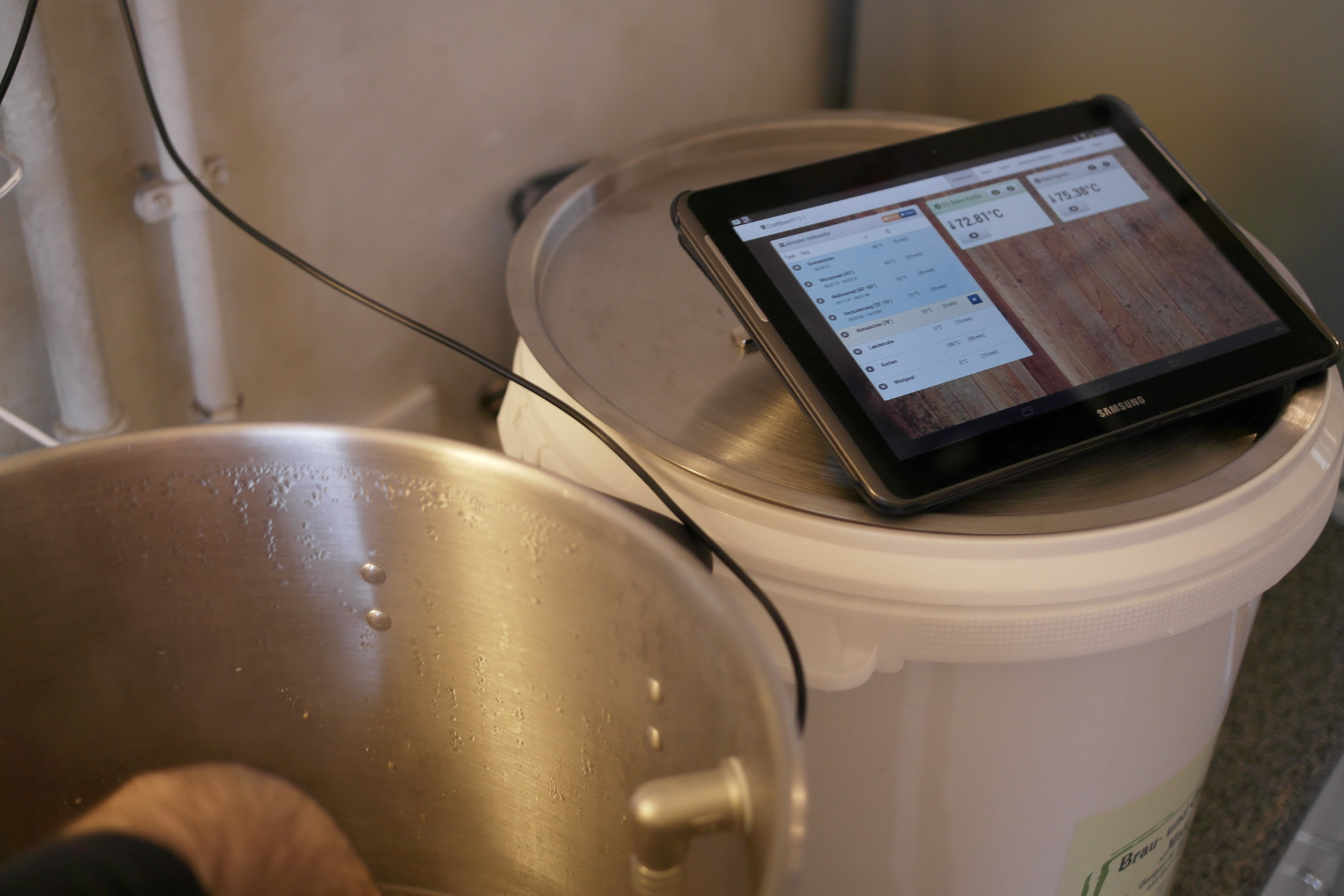 Magier-Fix Mischung für Weißbier: Einmaischen im 38l Ss Brewtech Kettle: Läuterblech und Eimer bereit, Absperrhahn geschlossen (mein liebster Braufehler: Hähne offenlassen) Sieht einigermaßen normal aus: Computer sagt "Abmaischen": Umschöpfen mit dem Meßbecher in den Läutereimer (oben links baumelt der Raspi): Ich habe diesmal in einen zweiten Eimer geläutert und dann zwei mal umgeschüttet, so konnte der Kessel parallel schon mal kräftig heizen. Sowieso ist die Aufheizrate von meinem Gasherd ganz ordentlich. Nachgüsse auf Schwimmer: Hopfenkochen (meiner neuer Topf hat schön Luft nach oben, das erspart die Angst vorm Überkochen) Braufehler Nr. 1: Trubdamm (sollte jetzt eigentlich im Topf stecken