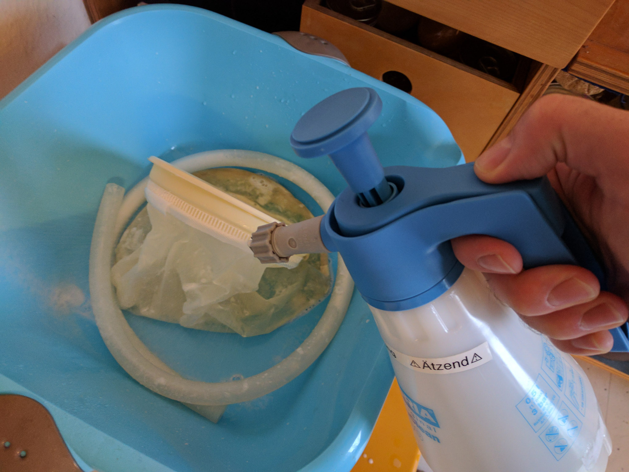 Wegen des Star San habe ich eigentlich keine Bedenken, das ist ja nur Phosphorsäure. Auf der Webseite wird explizit erwähnt, dass man eine Sprühflasche verwenden kann. Außerdem verwende ich einen Schaumsprüher, der erzeugt kaum Nebel.