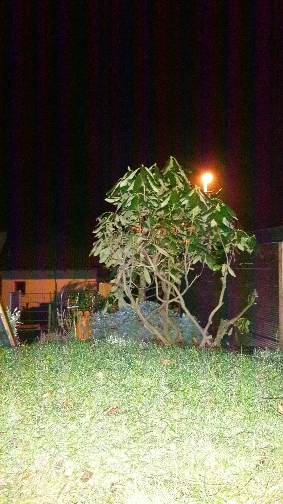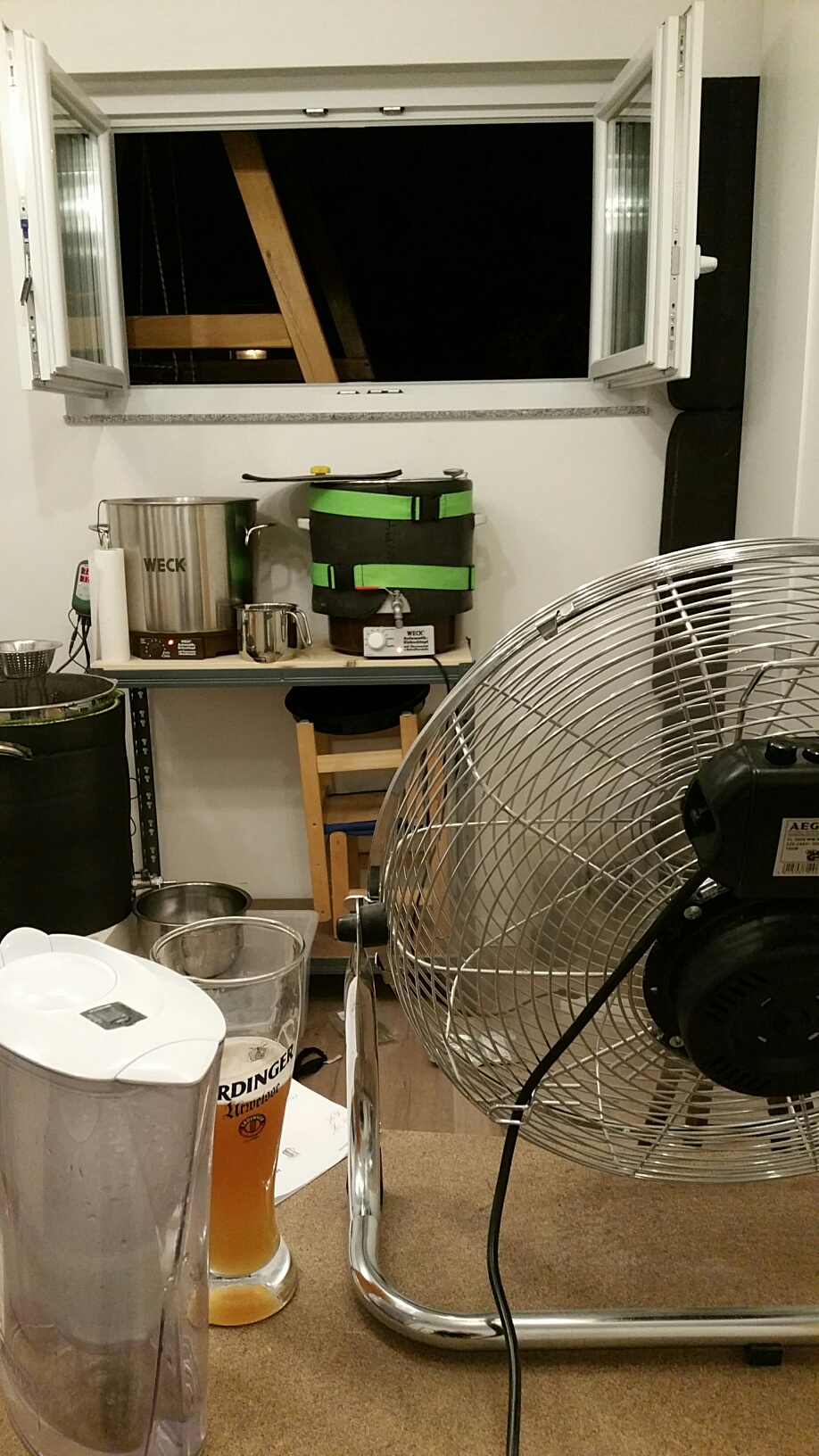 Wenn ich in der Aufheizphase mal nicht gerührt habe, dann schoss die Temperatur am Fühler hoch. Wenn ich jedoch die Maische bewegt habe, dann relativierte es sich. Ich denke, dass es mit einem Rührwerk genauer werden würde. Dann bin ich die Rasten gefahren bis Jod normal. Umbeschöpft in den Läutereimer/Gäreimer und dann ging es los mit dem Läutern Nebenbei habe ich dann das Hopfenkochen vorbereitet. Immernoch mit meinem alternativen Brüden-Ventilator Es war schon längst dunkel, da kam ich nun mal zu meiner Pause Aber vorsicht. Ganz leichter Regen und Bodenfrost. Das merkte ich auch gleich beim ersten und einzigen Schritt zum Grill.