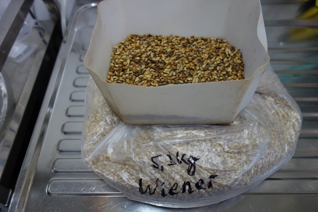 Mein dry aged Malz: Die Crankandstein (aka Frankenstein) zermalmt gnadenlos jedes Korn Und als die 52°C erreicht sind, wird eingemaischt. Es passen übrigens 15-16 Liter zwischen die Siebe. Man kann den Abstand auch auf ca. 10 Liter stellen.