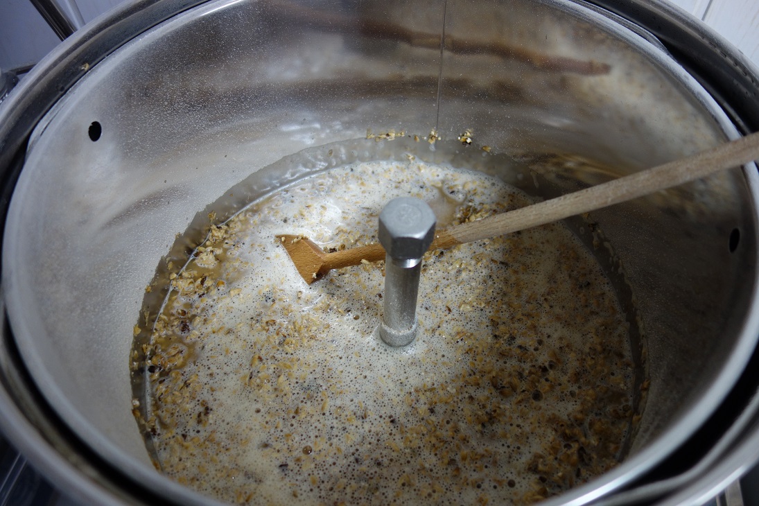 Übergeschwänzt habe ich übrigens mit 52°C Heißwasser aus der Leitung. Mit Milchsäure auf pH 5,5 -6 eingestellt und in 7 Liter Schüben, schwupp auf den Treber.