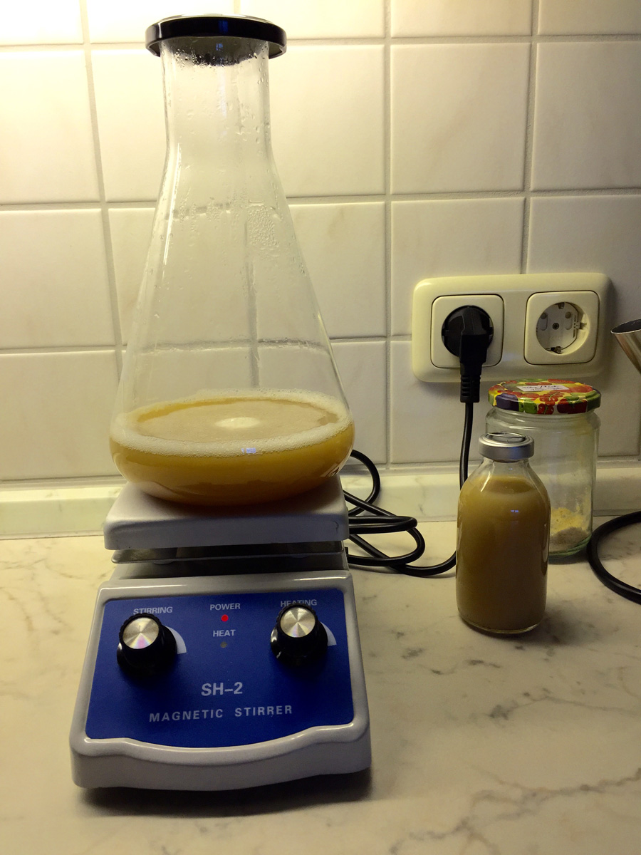 Nachgefüttert wird alle 12-24 Stunden mit Malzbier aus einer neu geöffneten Flasche. Der Magnetrührer bleibt 24/7 an.