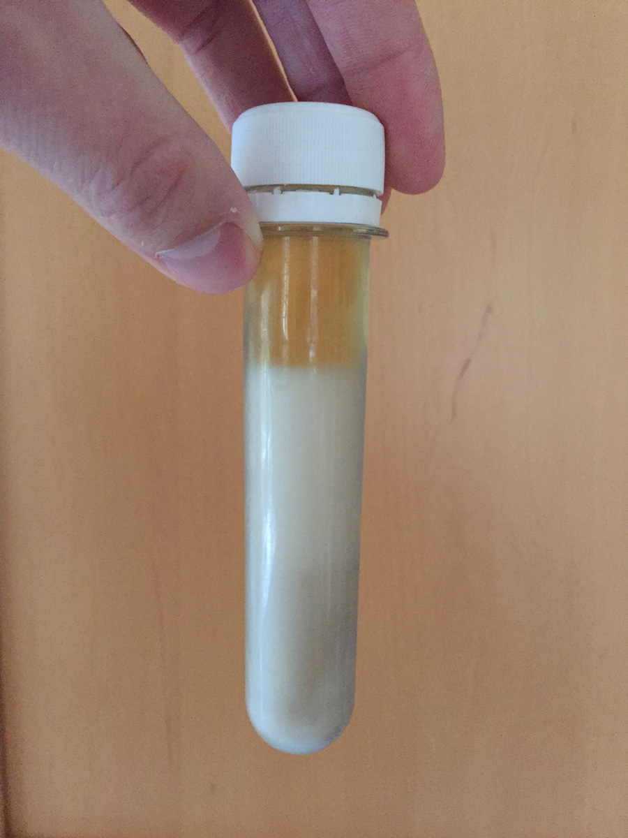 Daraus habe ich dann auch gestern eine 15 ml-Portion entnommen und in einen DME-Starter gegeben. Heute morgen war deutliche Aktivität zu sehen. Gute Sache.