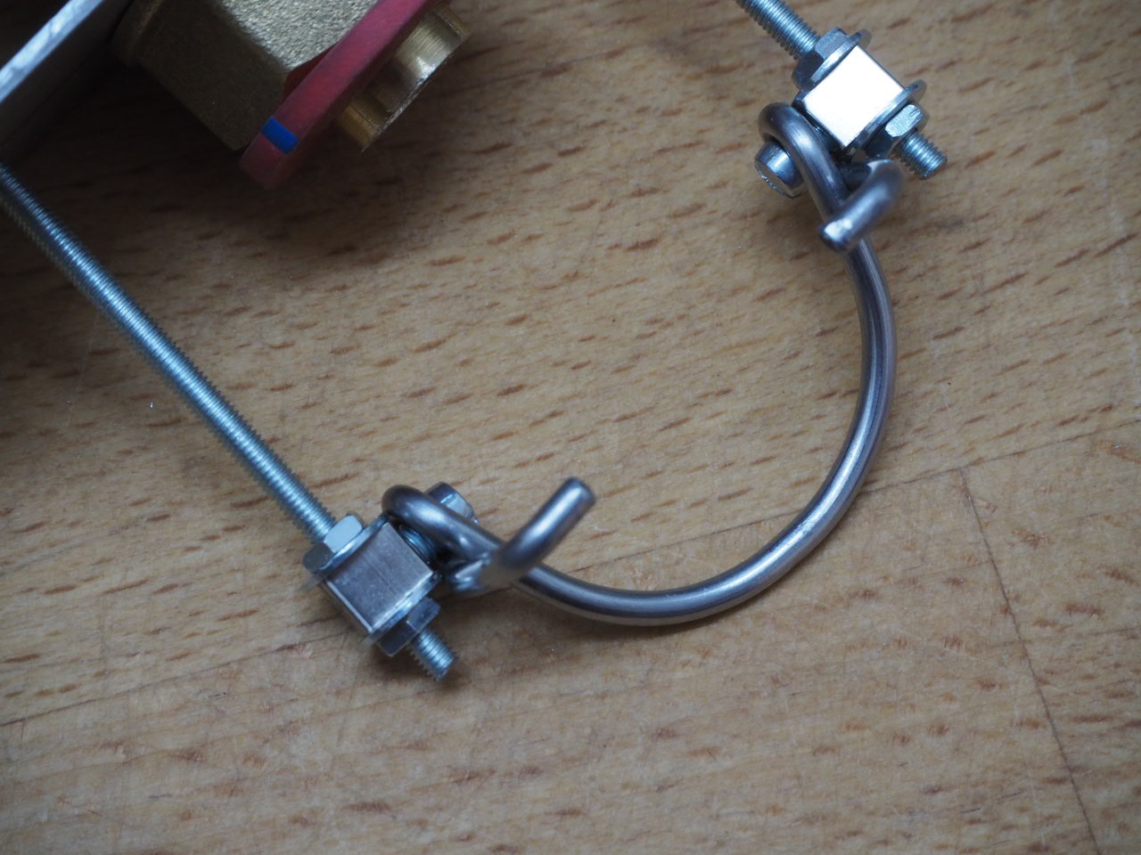 Nachdem mir gleich beim Biegen die Gewindestange gebrochen ist, ist mir als Abhilfe die Idee mit dem metallischen Innenteil einer einreihigen Lüsterklemme gekommen.