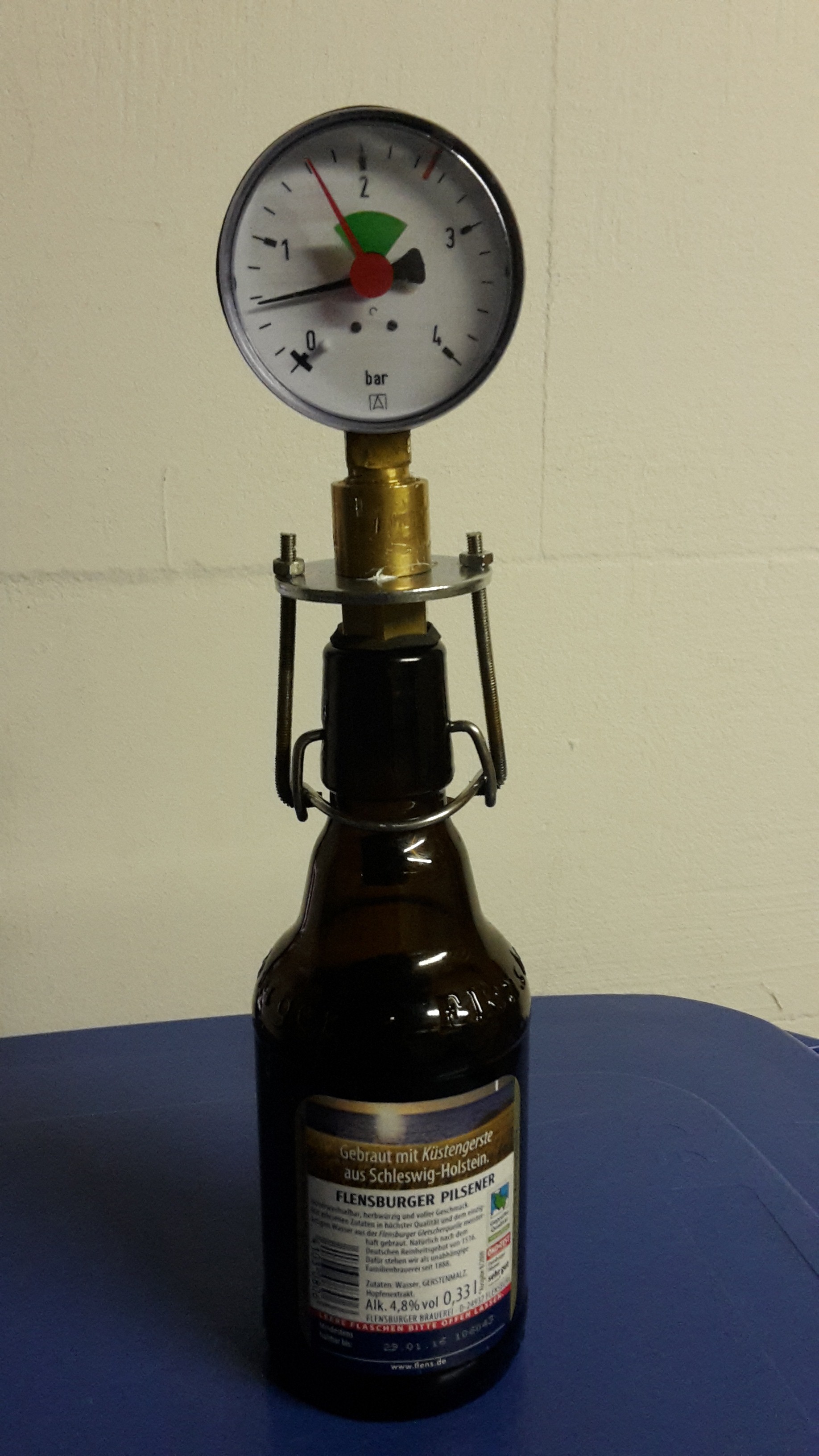 So denne ein bischen gebohrt ( Löcher in die U-Scheibe), ein bischen gebogen ( Gewindestange) und alles mit dem Bügelverschluß an die Flasche montiert. Und es funzte sofort ( Pulle wurde mit Mineralwasser gefüllt und geschüttelt ). Der Druck hält seit 3 Stunden.