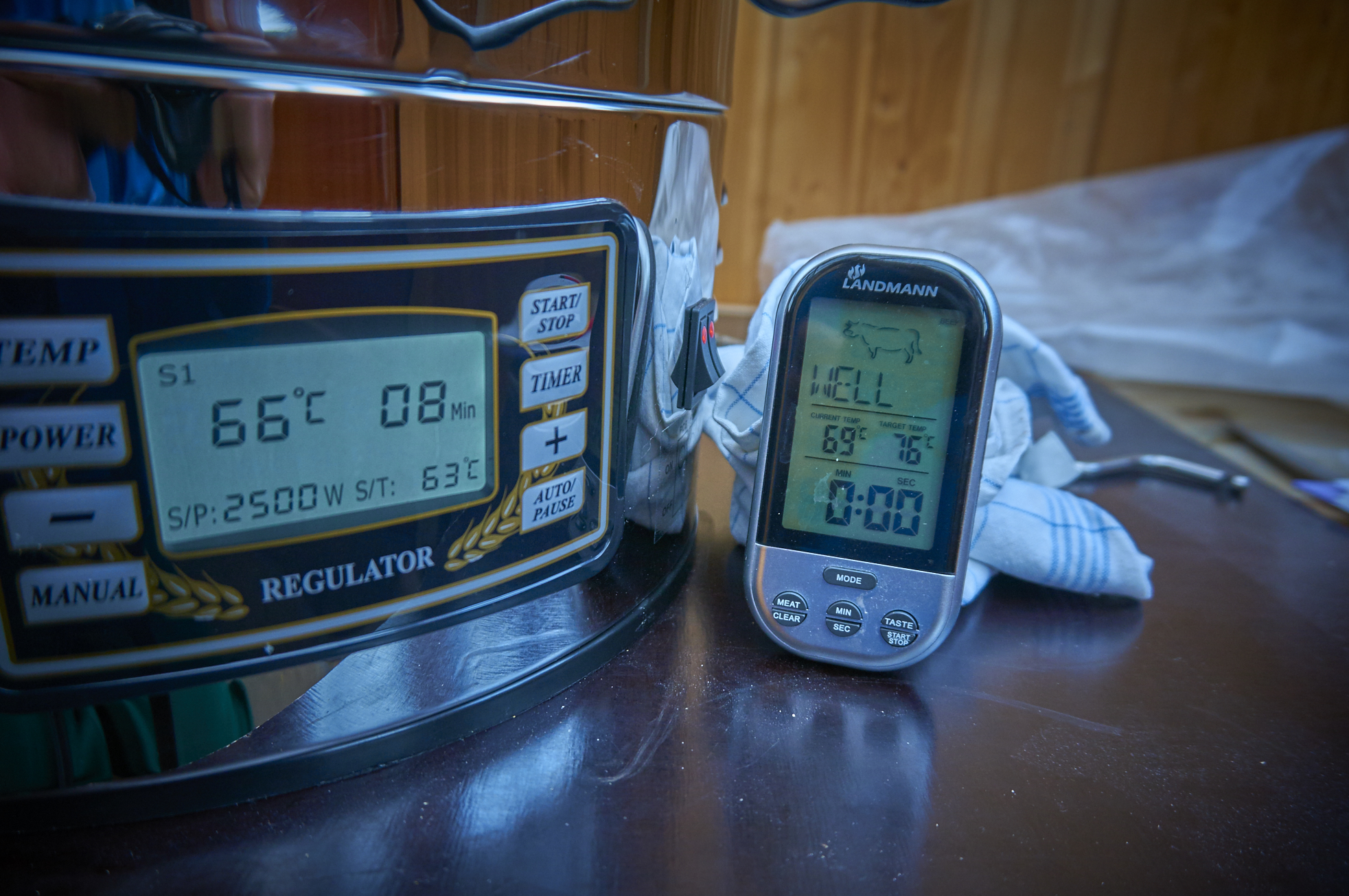 Das mit der Pumpe wirkt etwas abenteuerlich, funktioniert aber prima. Überhaupt macht das Ding ein ganz ordentlichen Eindruck. Ist bis 2500 Watt - in 100 Watt Stufen regelbar. Man kann auch jederzeit in die programmierten Vorgänge eingreifen. Fürs „Wallendkochen“ ohne Manschette draußen im Gartenhäuschen brauchte ich vor 4 Wochen aber schon die 2400 oder besser 2500 Watt. Die Temperatur überschießt zunächst auch hier ein wenig, pendelt sich dann aber stabil ein.