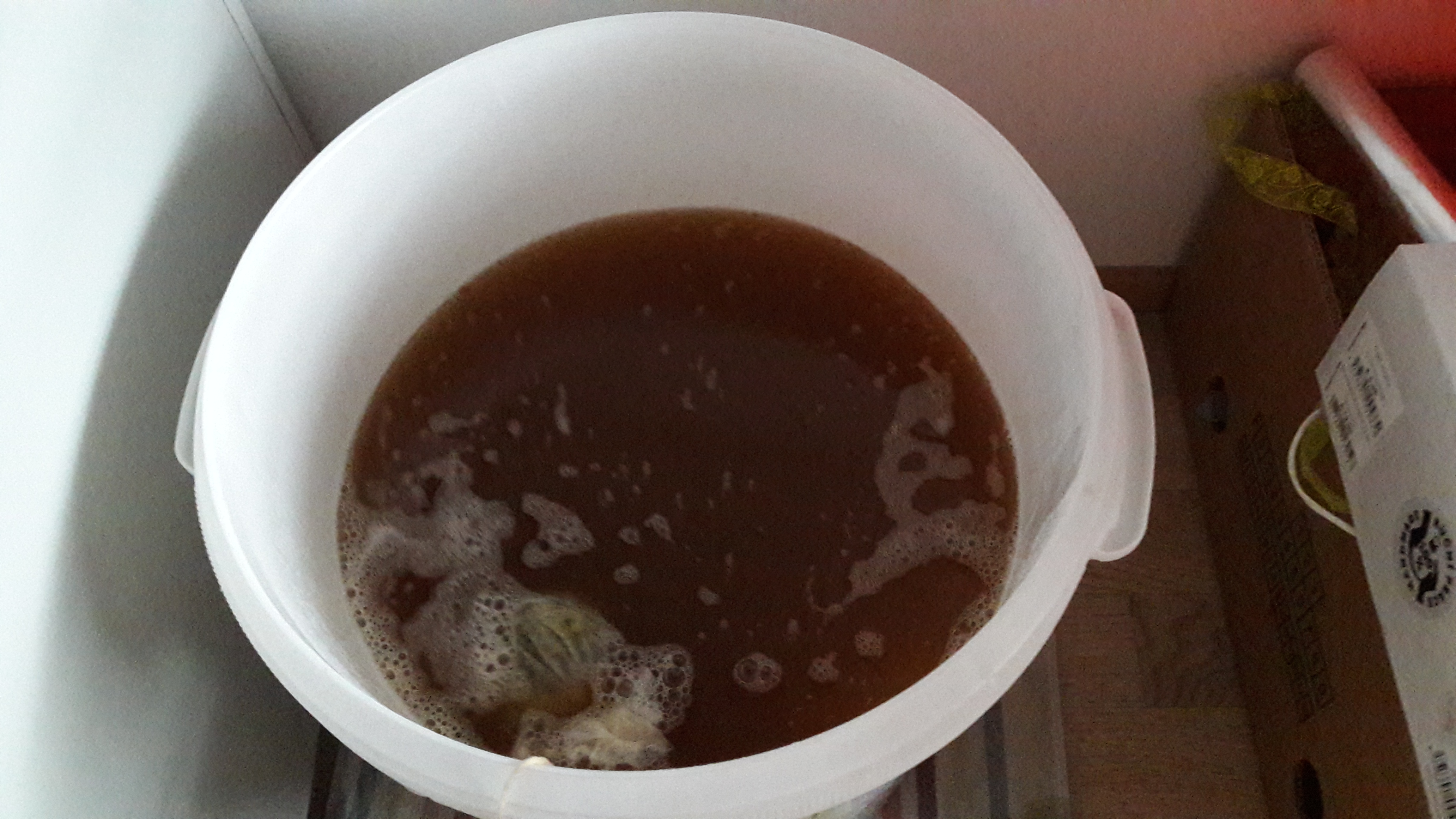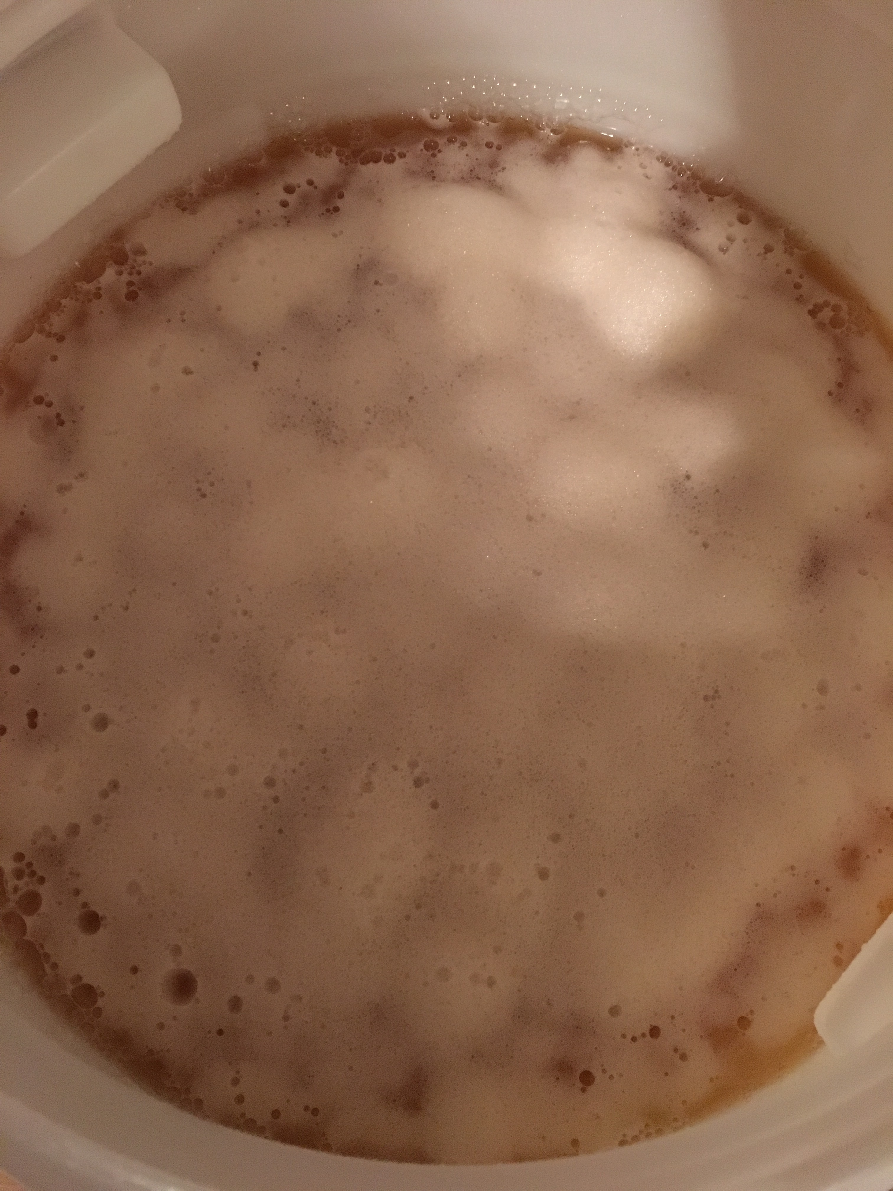 Der Sud heute morgen um 9:00 Uhr; gestern um 14:00 Uhr die Hefe hinzugefügt, um 18:00 Uhr das erste Blubbern. der Sud steht bei 20°C im Wohnungsflur, da mir die 13° Kellertemperatur für den Sud doch zu niedrig ist.